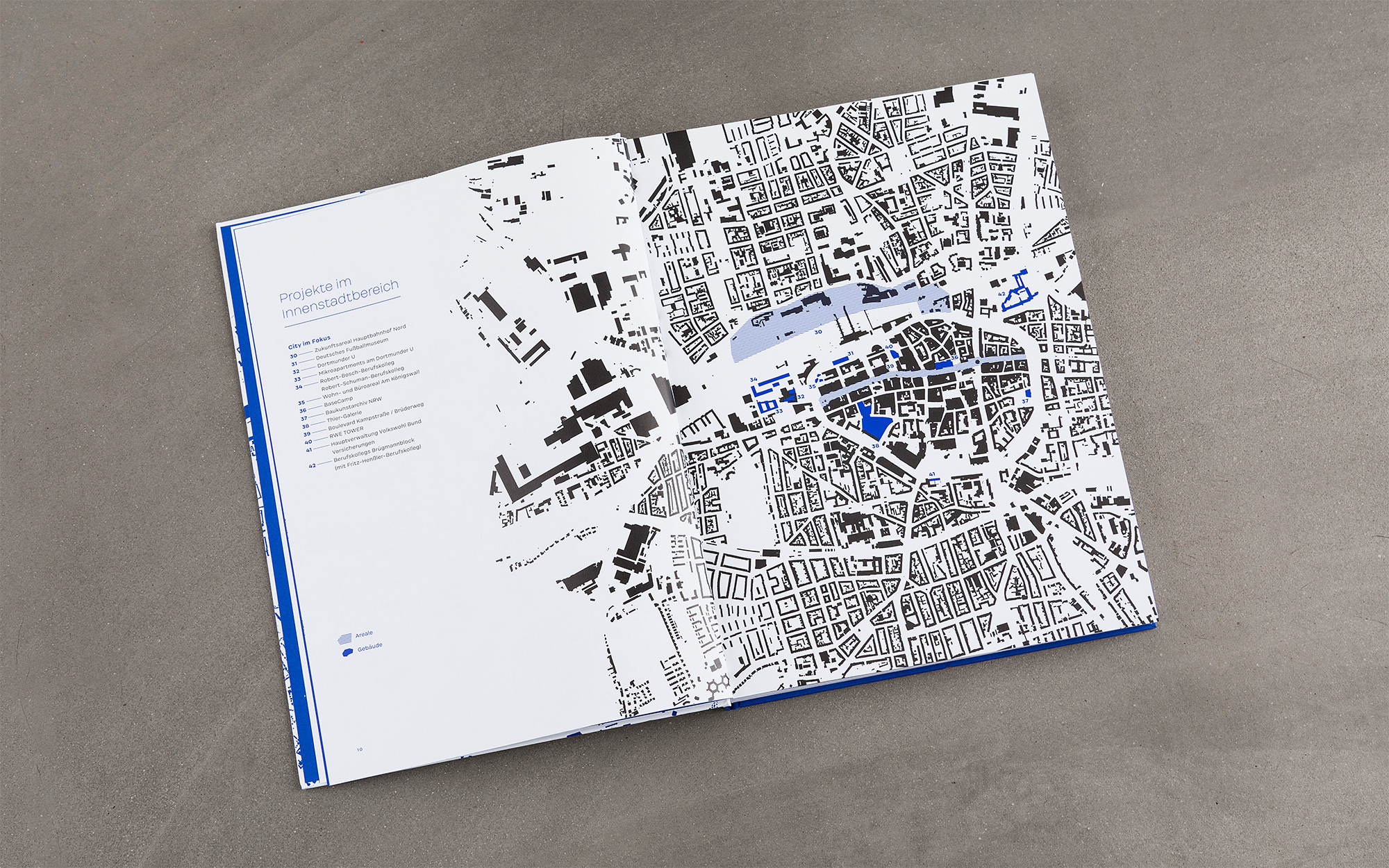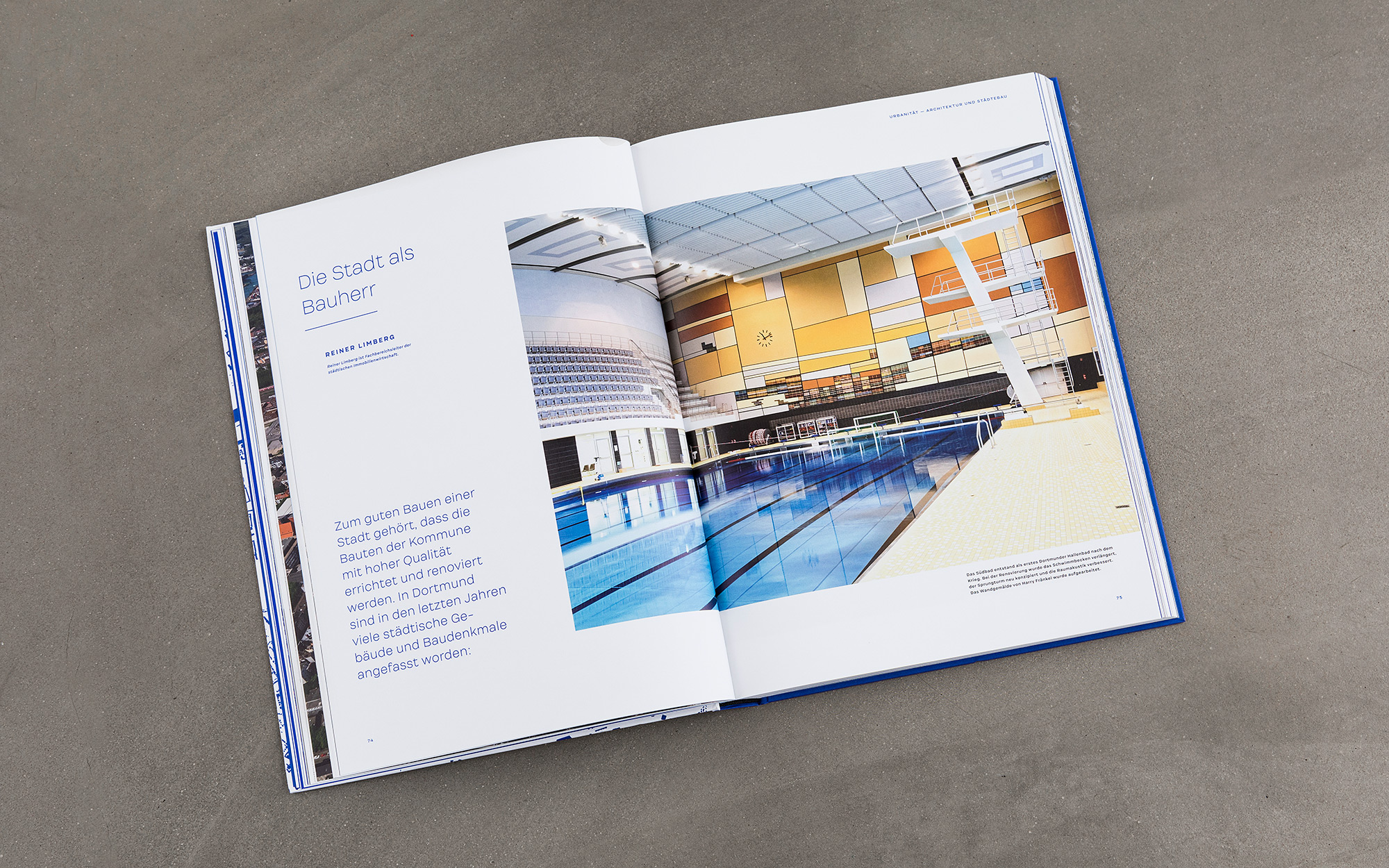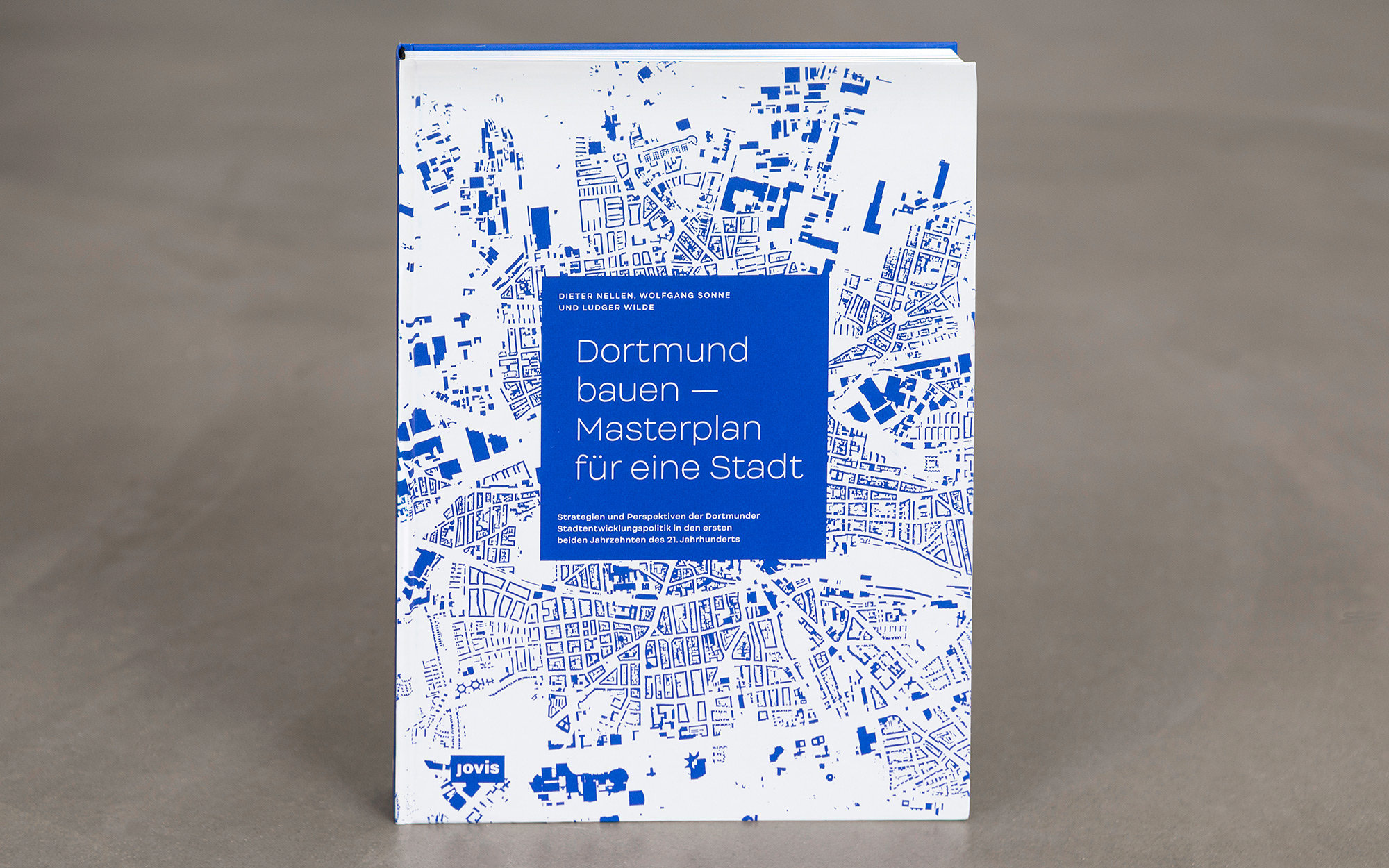 ›Dortmund bauen – Masterplan für eine Stadt‹ dokumentiert die Strategien und Perspektiven der Dortmunder Stadtentwicklungs- und Kulturpolitik des 21. Jahrhunderts. In mehreren Themenclustern beleuchtet das Buch jene Projekte und Areale, die für die aktuelle Transformation der bevölkerungsreichsten Stadt des Ruhrgebiets von besonderer Relevanz sind. Die Gestaltung gibt den Bildern, Plänen und Texten viel Raum. Einen eigenen Charakter erhält das Design vor allem durch die zurückhaltende und dennoch markante Typografie sowie durch das von Yves Klein inspirierte Blau.