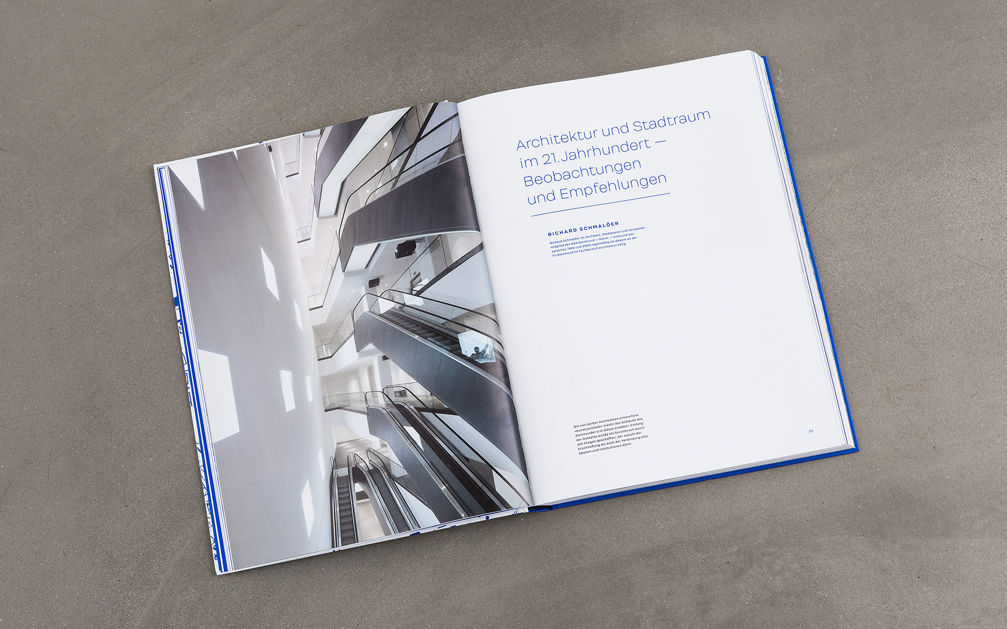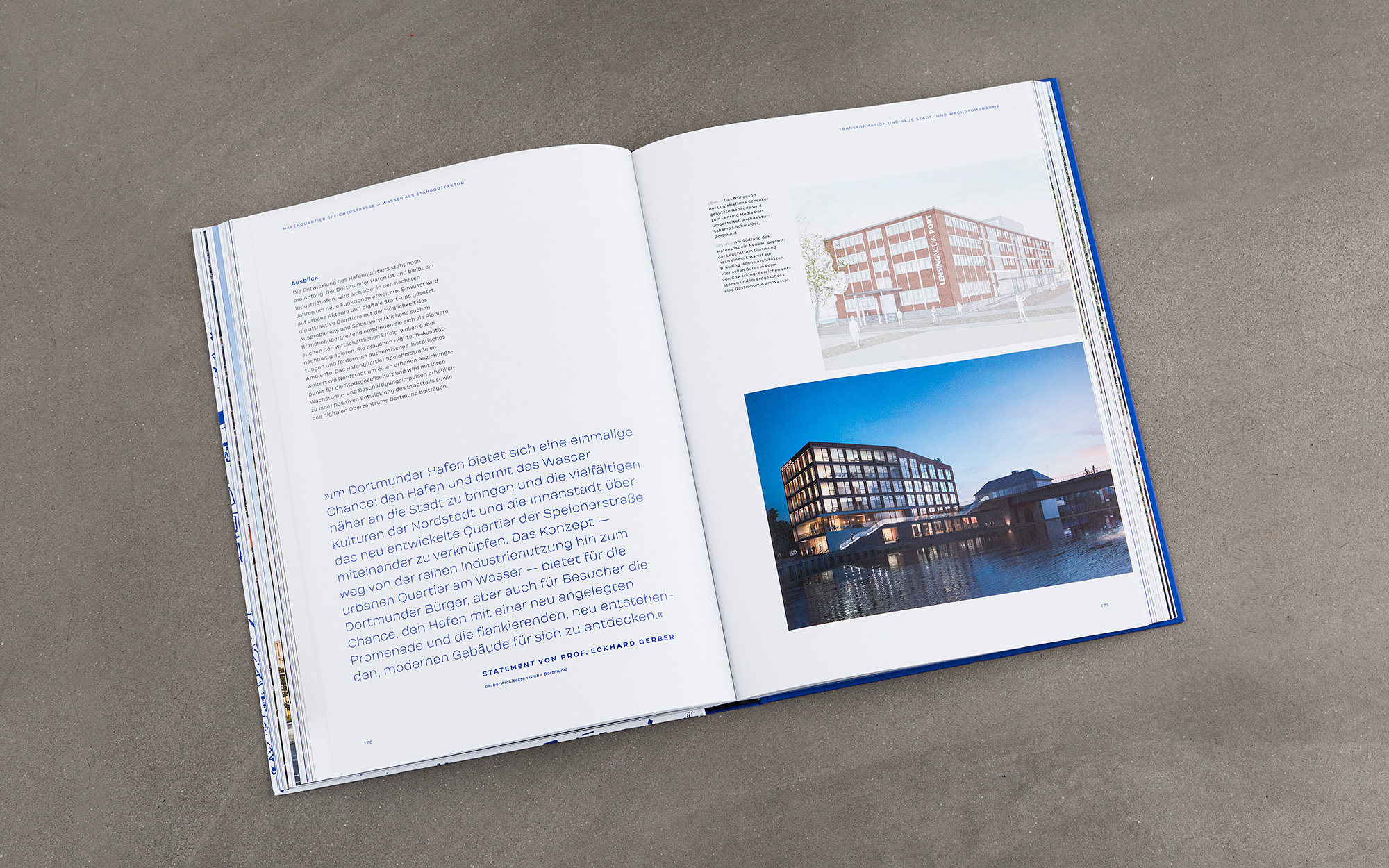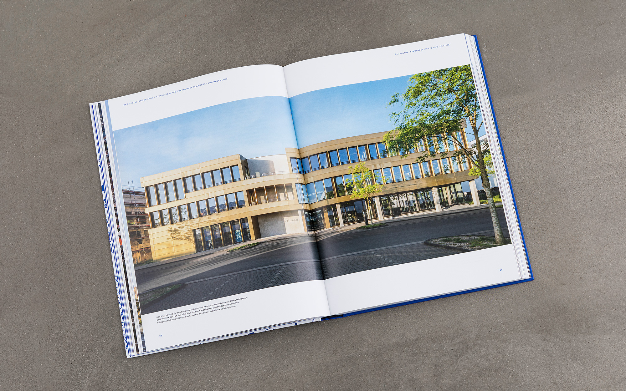 ›Dortmund bauen – Masterplan für eine Stadt‹ dokumentiert die Strategien und Perspektiven der Dortmunder Stadtentwicklungs- und Kulturpolitik des 21. Jahrhunderts. In mehreren Themenclustern beleuchtet das Buch jene Projekte und Areale, die für die aktuelle Transformation der bevölkerungsreichsten Stadt des Ruhrgebiets von besonderer Relevanz sind. Die Gestaltung gibt den Bildern, Plänen und Texten viel Raum. Einen eigenen Charakter erhält das Design vor allem durch die zurückhaltende und dennoch markante Typografie sowie durch das von Yves Klein inspirierte Blau.