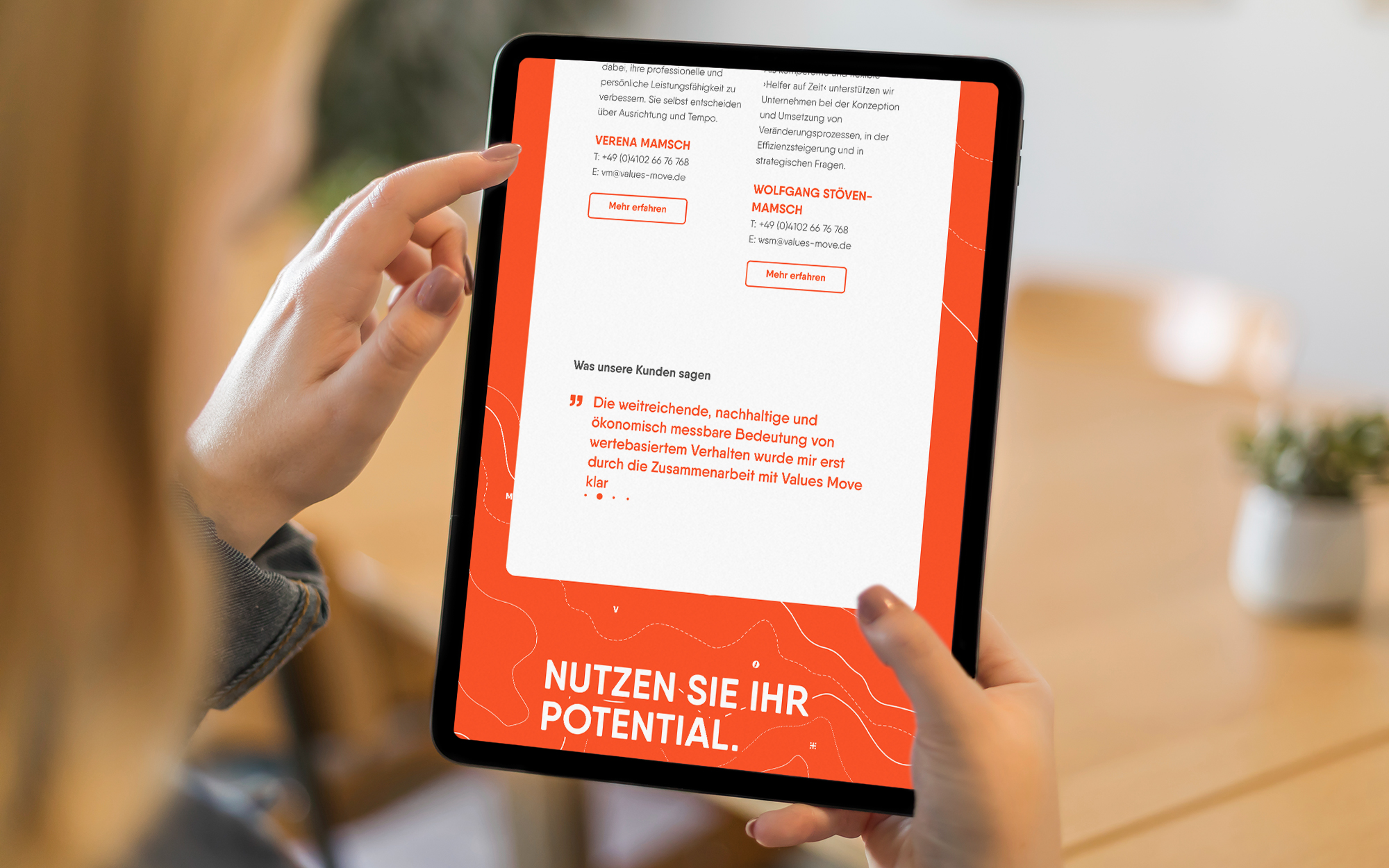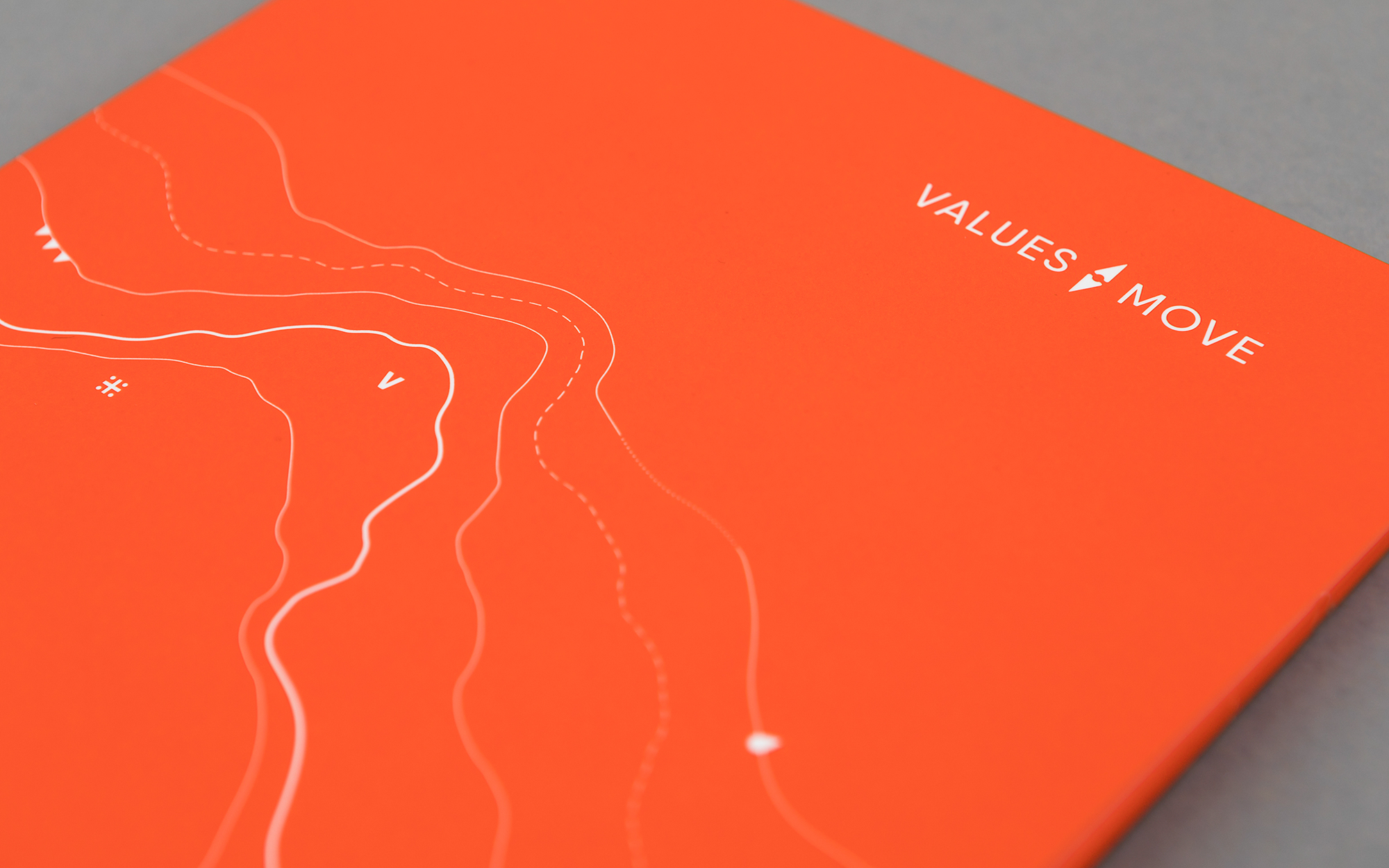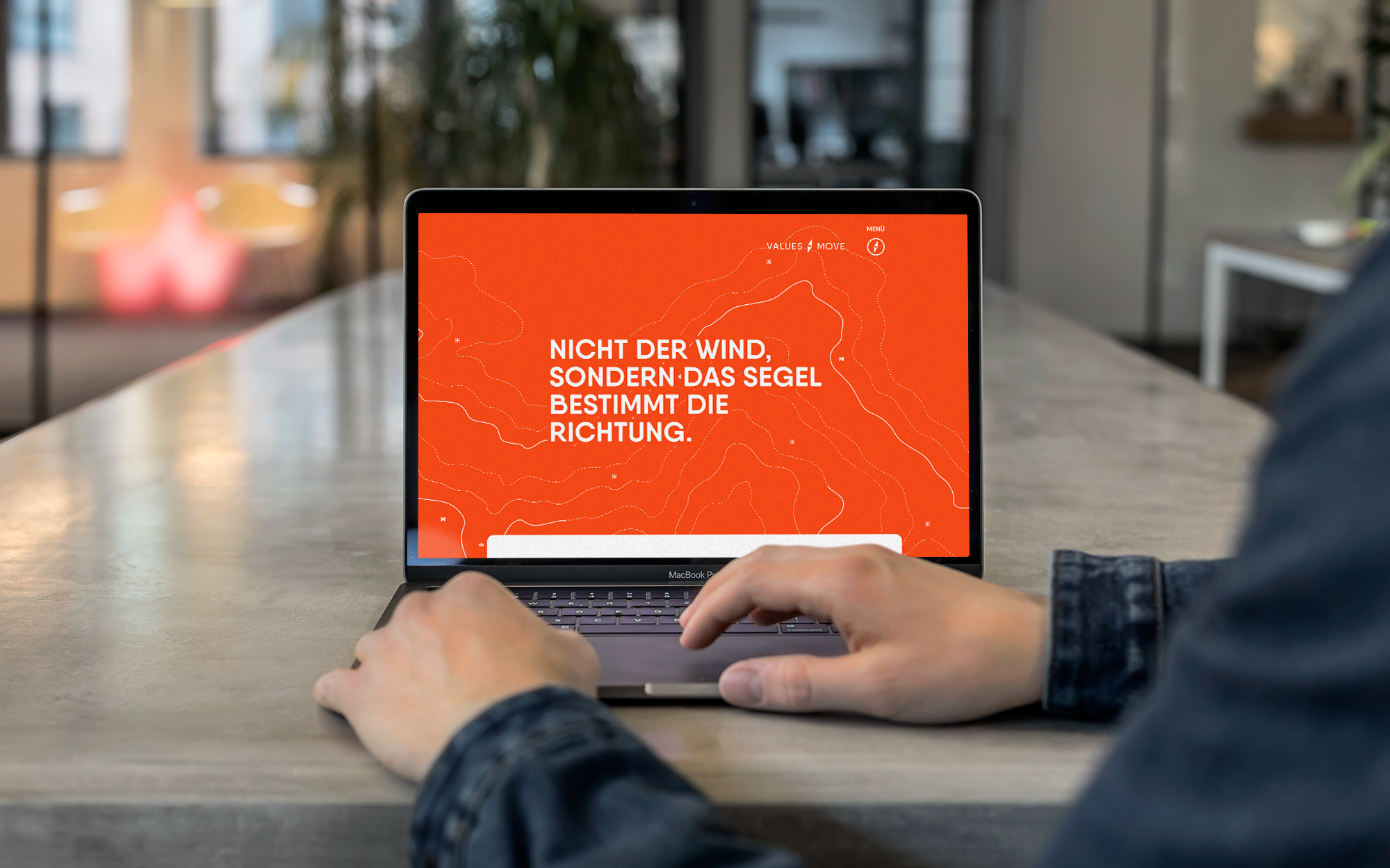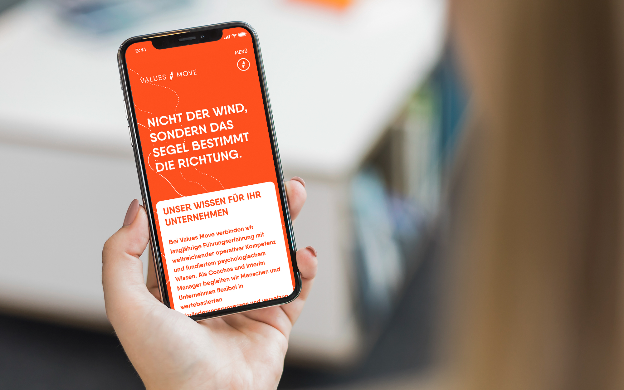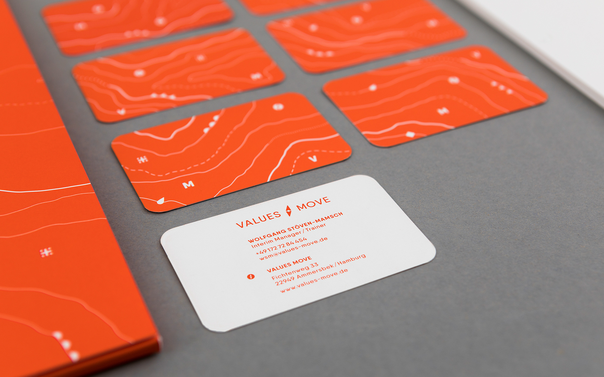 Teams motivieren, gemeinsam an einem Strang zu ziehen, Unternehmen und Menschen auf neue Ziele ausrichten, Gefahren sicher erkennen und umschiffen: Maritime Assoziationen ergeben sich angesichts des Values Move-Portfolios fast von allein. Und da die beiden Coaches und Interim Manager privat große Segelfans sind, stand die Entscheidung für das inhaltliche wie gestalterische Leitmotiv schnell fest. Das eigenwillige Corporate Design sticht aus der Masse an Coaching-Angeboten deutlich heraus. Dafür sorgt schon das knallige, großflächig eingesetzte Bojen-Orange. Seekarten-Optik prägt die Gestaltung der Geschäftsausstattung und der Website und findet sogar Eingang in die Porträt-Illustrationen. Im Logo versinnbildlicht eine Kompassnadel die Leistungen und Angebote von Values Move.‹