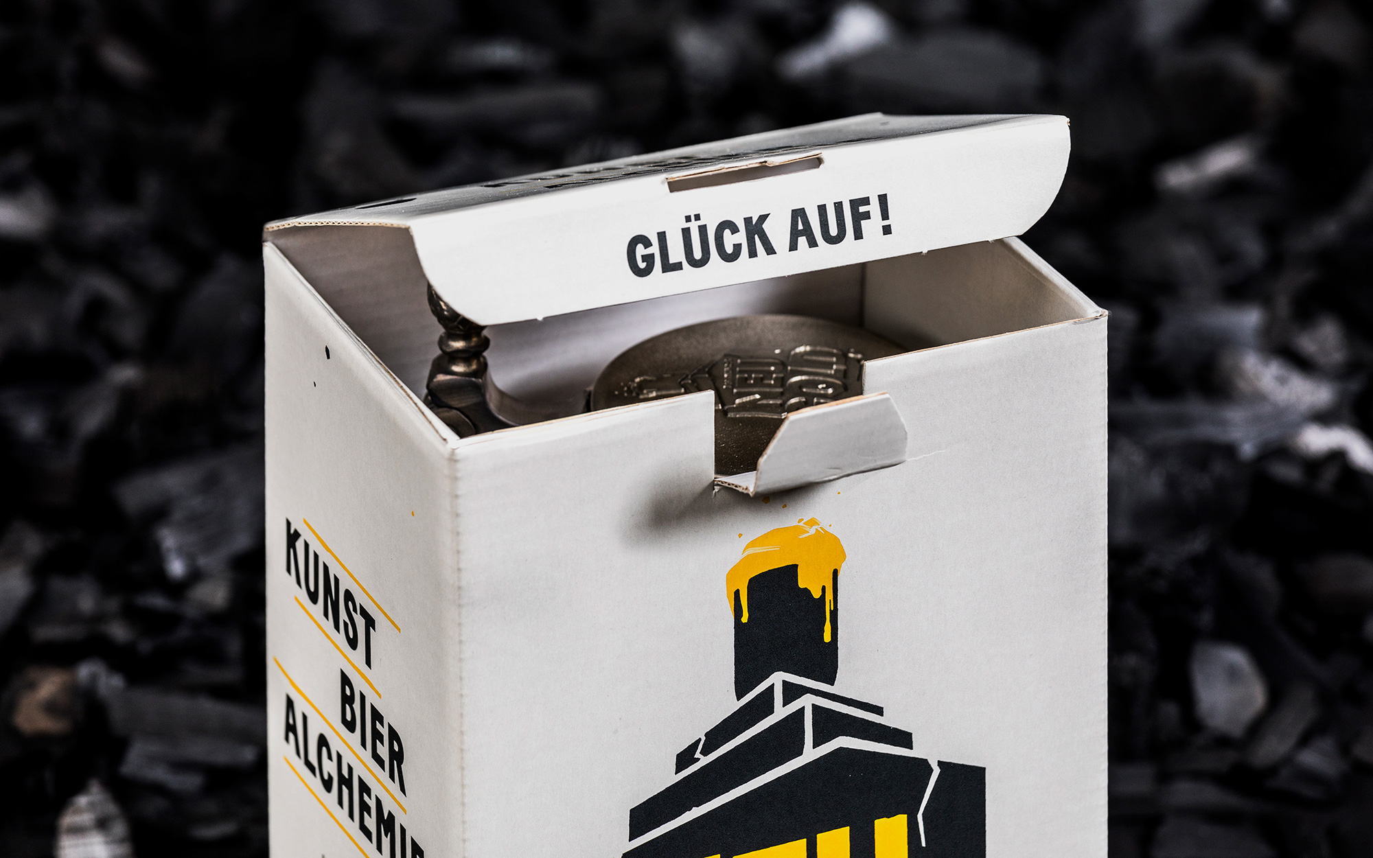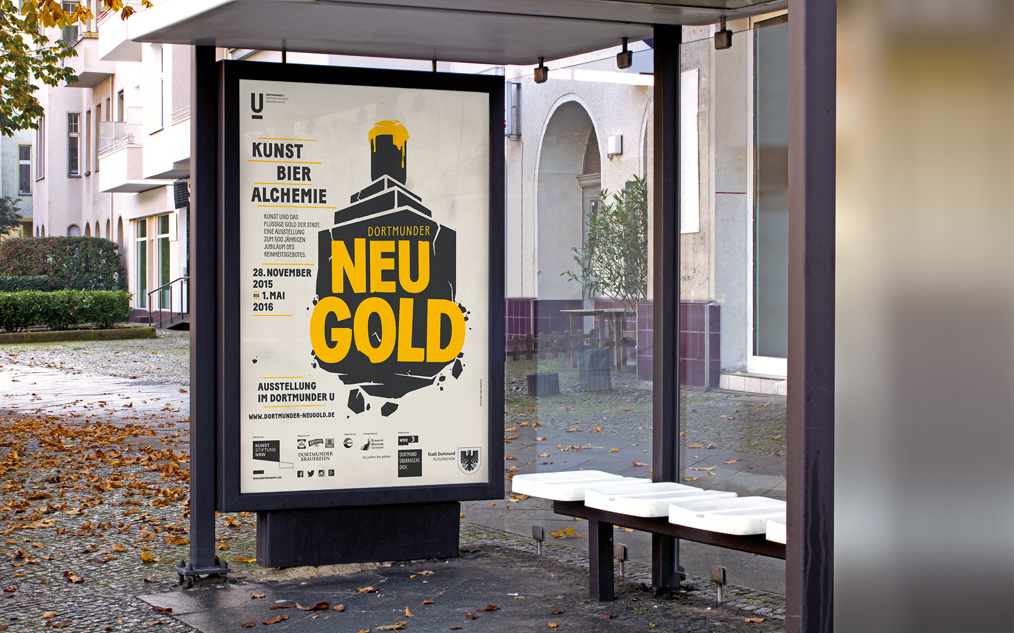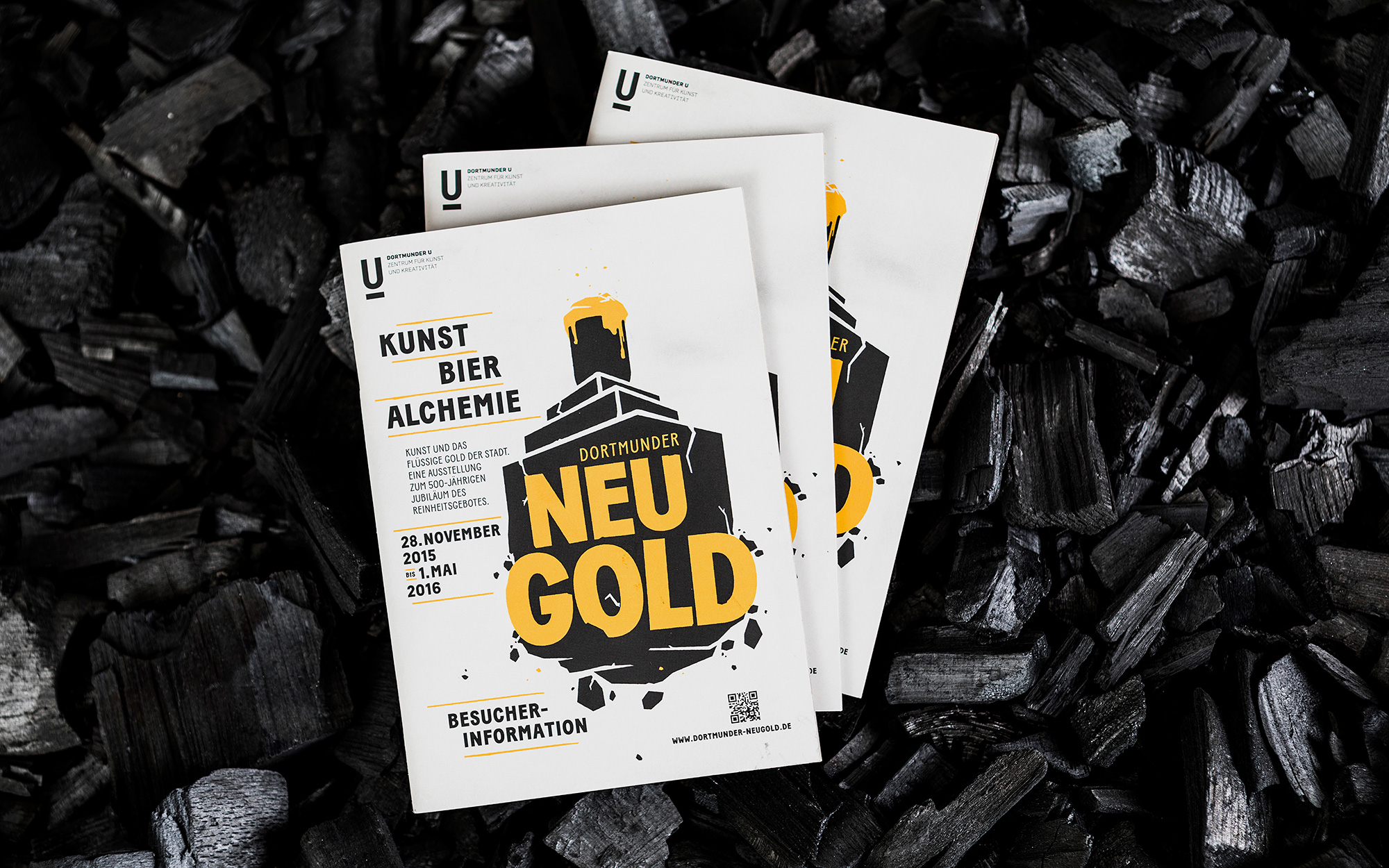 Anlässlich des 500-jährigen Jubiläums des deutschen Reinheitsgebots zeigte das Dortmunder U 2016 eine große Ausstellung zum Wechselspiel von Kunst, Bier und Alchemie. ›Dortmunder Neugold‹ befasste sich mit dem Thema passenderweise an einem Ort, der wie kaum ein anderer den Strukturwandel der Bierstadt repräsentiert: dem ehemaligen Gärturm der Dortmunder Union Brauerei. Die Gestaltung spielt mit dem U-Turm als zentralem Symbol für die Dortmunder Vergangenheit, Gegenwart und Zukunft. Bundesweit war das Key Visual auf Flaschen diverser Dortmunder Brauereien zu sehen. Die groß angelegte Kampagne umfasste Plakate und Flyer, Produktverpackungen, Ausstellungskataloge und vieles mehr. Hintergründe, das Programm der Ausstellung sowie weiterführende Inhalte zum Thema standen auf einer responsiven Website bereit.
