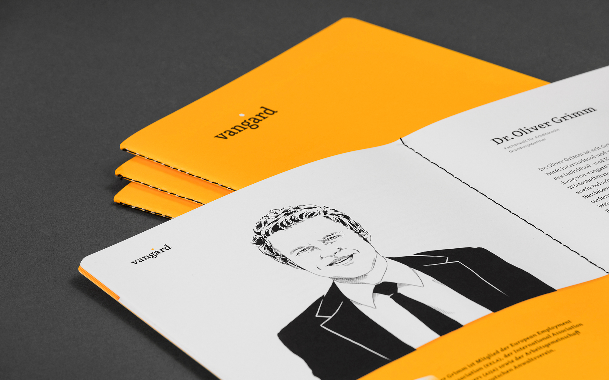 Traditionell vermitteln Anwaltskanzleien in ihren Auftritten meist Werte wie Sachlichkeit, Verlässlichkeit und eine manchmal etwas langweilige Bodenständigkeit. Für eine Kanzlei jedoch, die ihren Namen vom französischen »avant-garde« ableitet und sich Kreativität und Originalität auf die Fahnen geschrieben hat, sind diese Mittel sicherlich nicht gefragt. vangard heißt der frisch gegründete Zusammenschluss mehrerer Top-Anwälte mit Niederlassungen in Hamburg, Düsseldorf und München. Auf dem Gebiet des Arbeitsrechts will die junge Kanzlei mit der Verbindung von Kompetenz und neuen Denkweisen Akzente setzen. Passend dazu verdeutlicht ein für das Justizwesen ungewöhnliches Corporate Design das Selbstverständnis als progressiver Impulsgeber: Kräftiges Gelb prägt sowohl Printmedien wie Visitenkarten, Broschüren und Briefpapier als auch die brandneue Internetpräsenz. Hochkontrastige, handgezeichnete Porträts unterstreichen den ungezwungenen und partnerschaftlichen Charakter der Kanzlei. Im selben Stil gehaltene Illustrationen verschmelzen die Wahrzeichen der drei Standorte zu einer »Super-Skyline«. Das i-Tüpfelchen bildet der »pentagonale skandinavische Schönheitsfleck« im Logo, der ganz nebenbei die neue Einheit der fünf Gründungspartner repräsentiert.