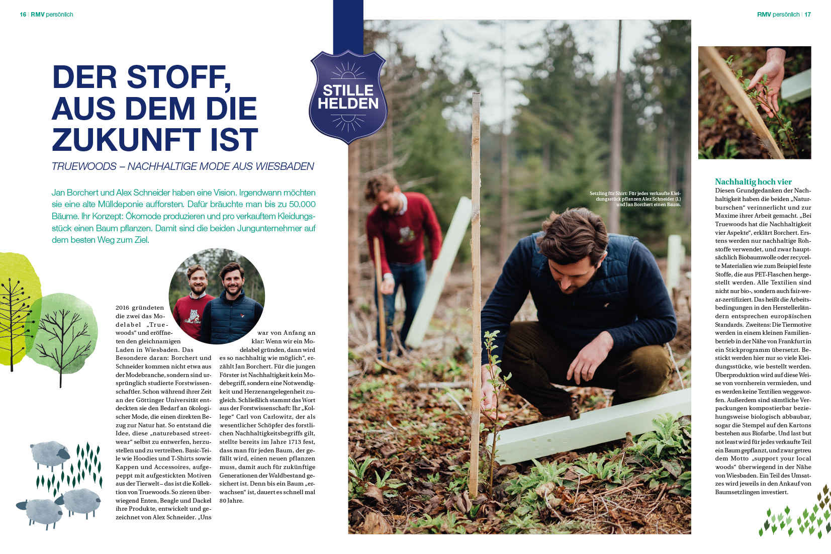 Für das Kundenmagazin rmvmobil (Ausgabe Sommer 2019, Schwerpunktthema Umwelt) habe ich – im Agenturauftrag – verschiedene Artikel geschrieben, z. B. über eine Frau, die regelmäßig gemeinsam mit Gleichgesinnten am Rheinufer den angeschwemmten Müll sammelt, oder über zwei junge Förster, die ein nachhaltiges Modelabel gegründet haben.