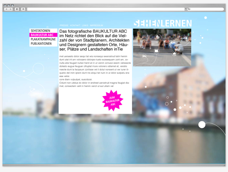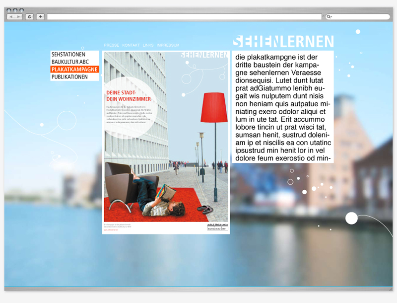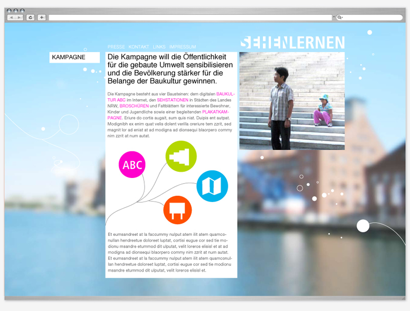 Die Kampagne sensibilisiert die Öffentlichkeit für die gebaute Umwelt und will die Bevölkerung stärker für die Belange der Baukultur gewinnen. SEHEN LERNEN besteht aus drei Bausteinen: dem digitalen BAUKULTUR ABC im Internet, der mobilen SEHSTATION in Städten des Landes Nordrhein-Westfalen sowie Broschüren und Faltblättern für interessierte Bewohner, Kinder und Jugendliche.