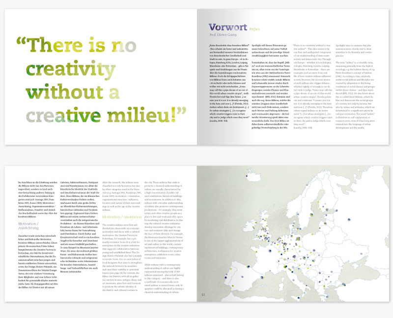 Die Publikation Spotlight- Creative Milieus in Europe möchte die Impulse der Kultur und Kreativwirtschaft in Politik, Wirtschaft und Gesellschaft näher untersuchen. Ziel ist es durch Projektevaluierung und internationale Forschungskooperationen aktuelle kulturbezogene und kreativwirtschaftliche Debatten aufzugreifen, weiterzuentwickeln und in der Praxis zu verankern.