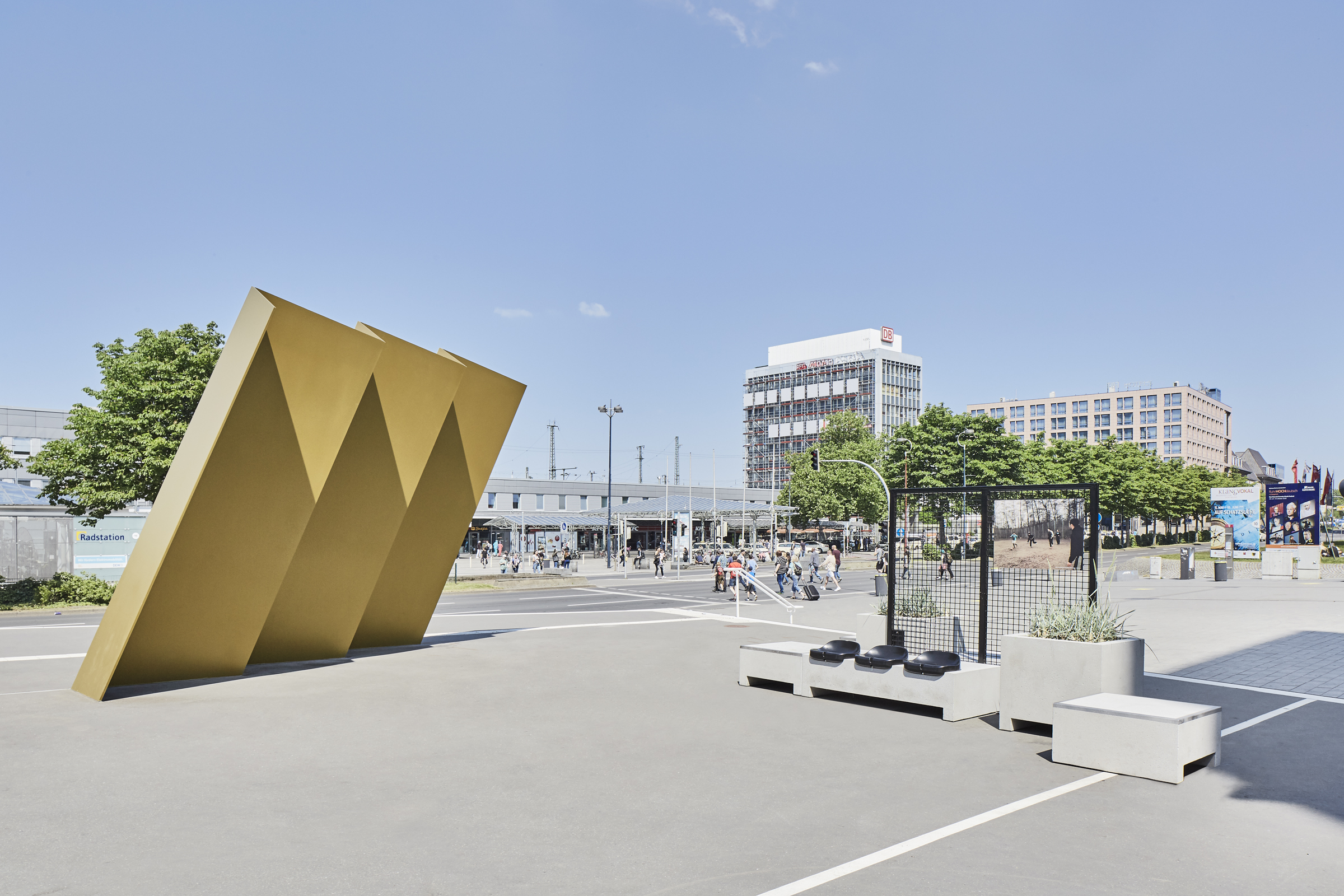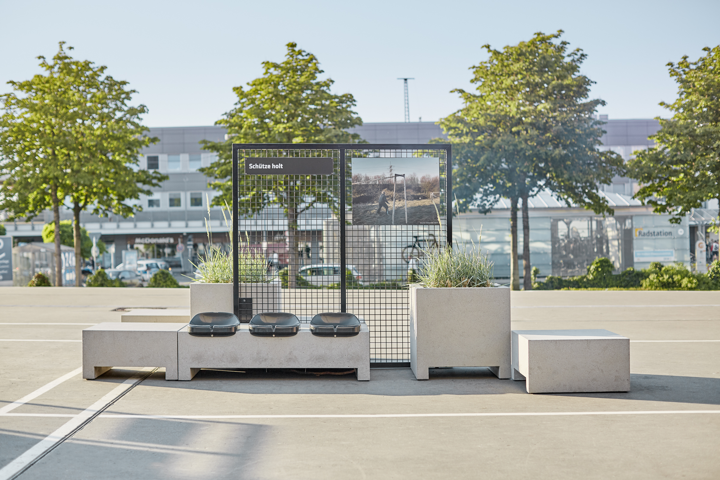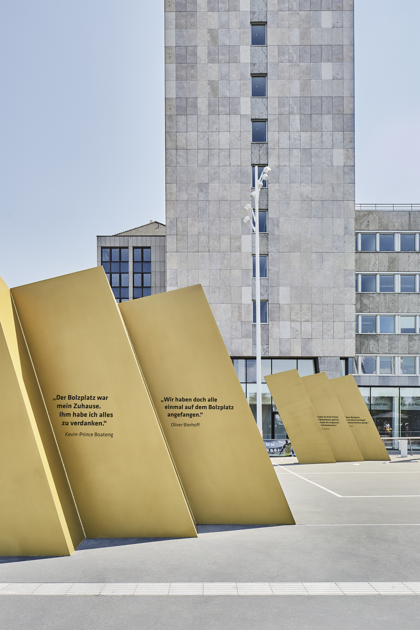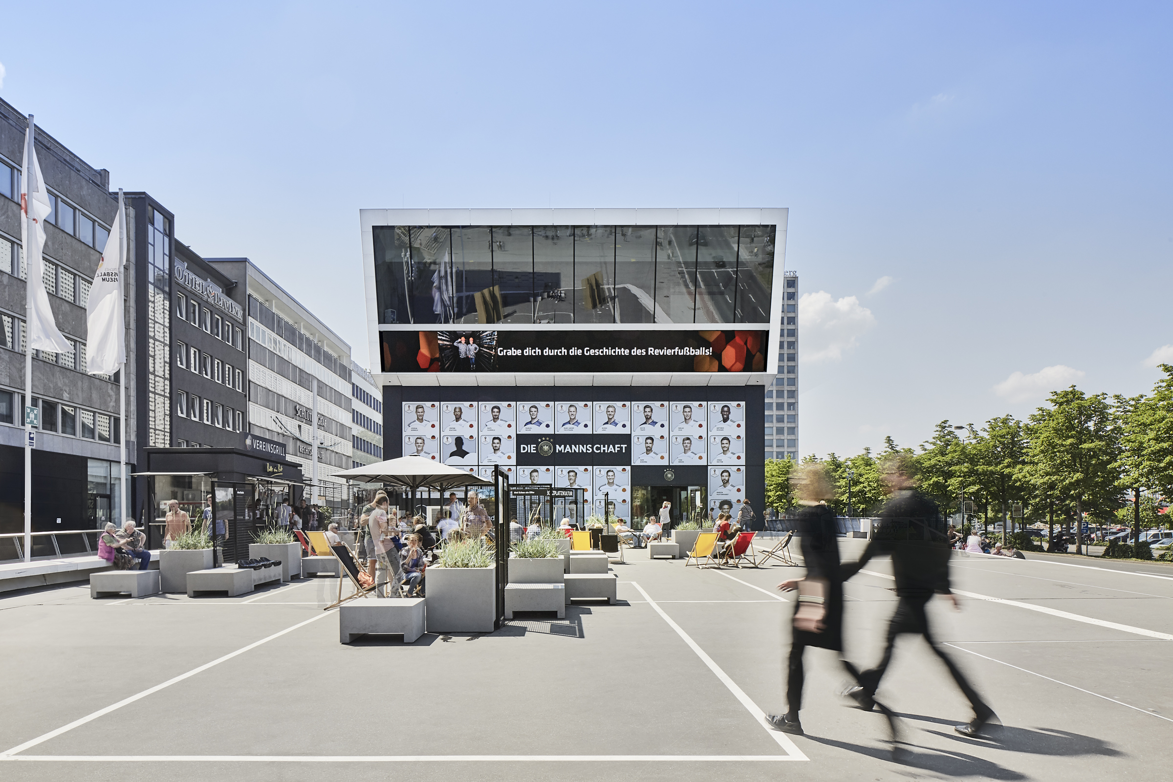 Anlässlich der Sonderausstellung „FußballLeben Ruhrgebiet“ im Rahmen des regionalen Kulturprogramms „Schichtwechsel“ wurde der Vorplatz des Deutschen Fußballmuseums neu konzipiert und gestaltet. Das modulare Stadtmobiliar aus Beton und Ausstellungselementen lehnt sich gestalterisch an das Thema „Bolzplatz“ an. Die bereits vorhandenen Stahlskulpturen werden als goldene Trophäen präsentiert. Fotos: Annika Feuss