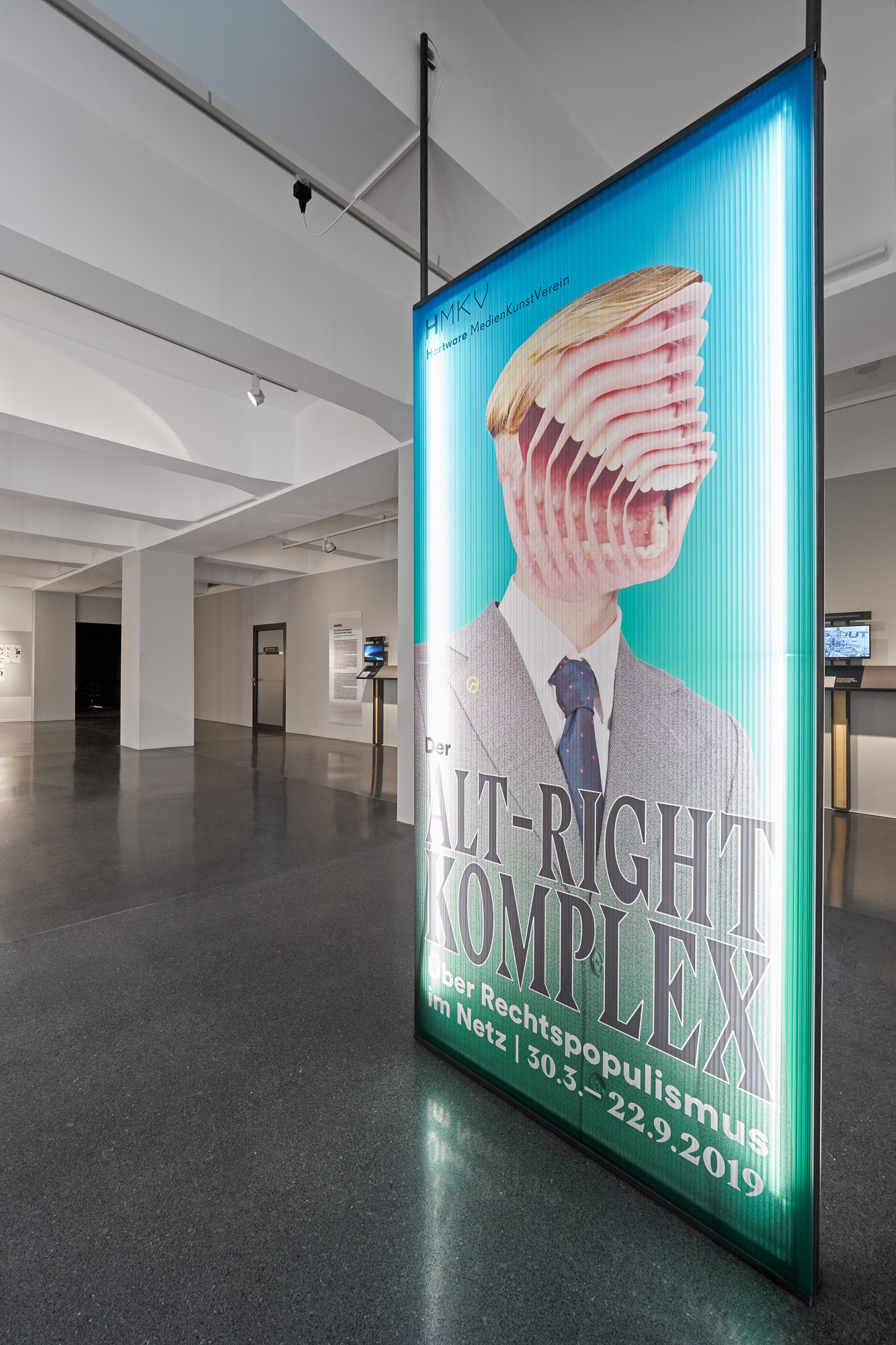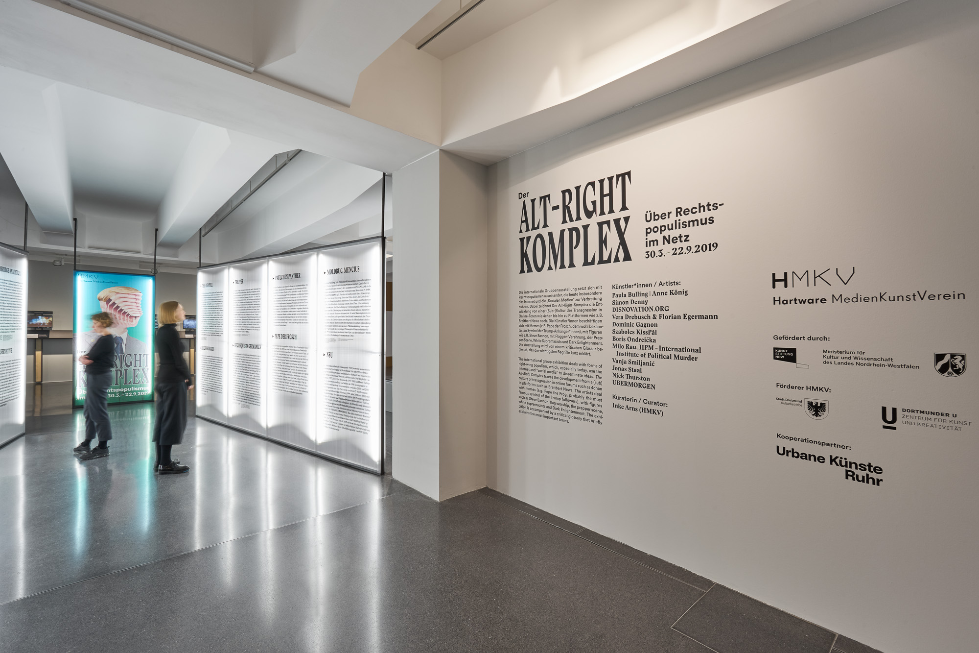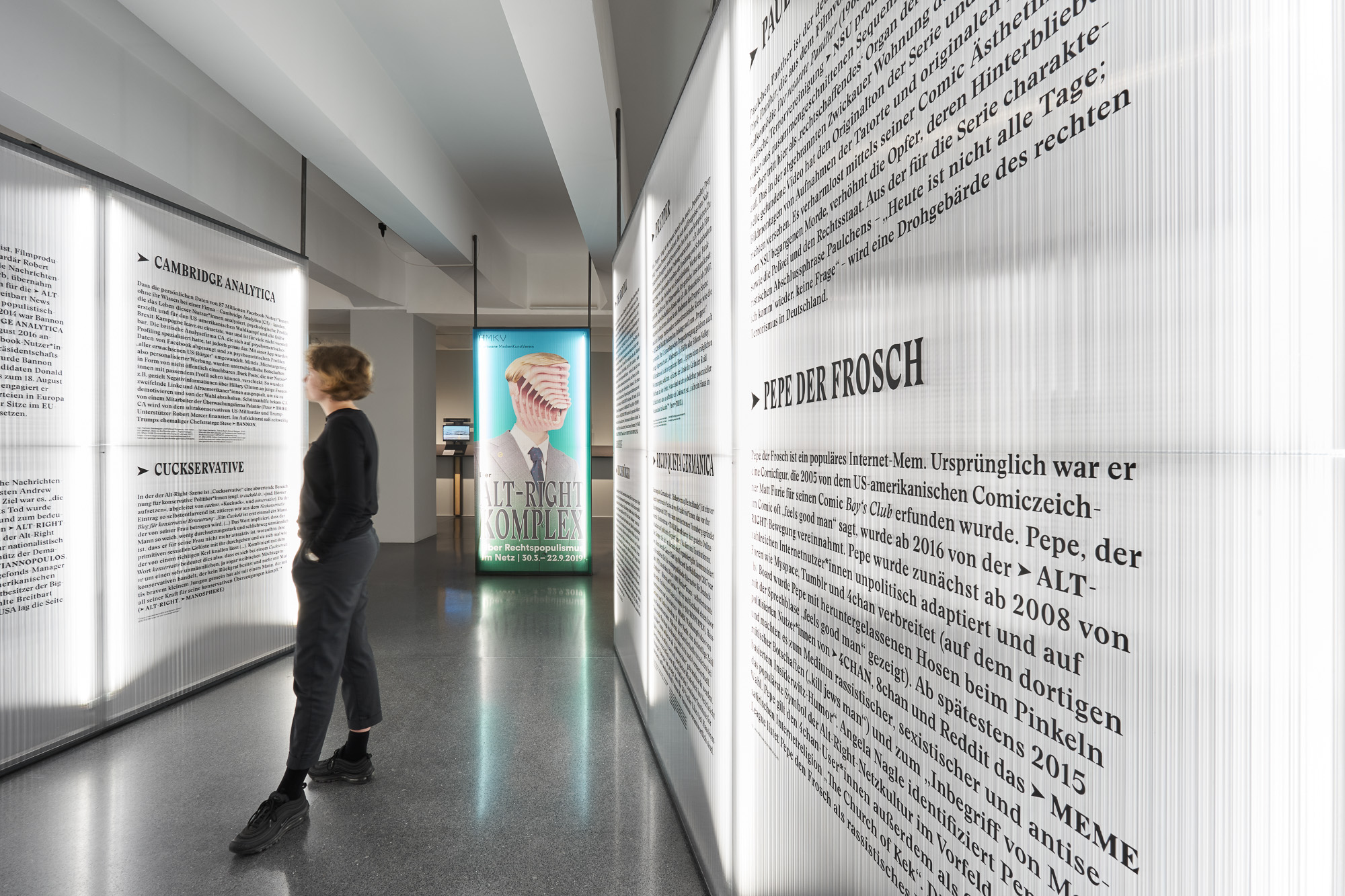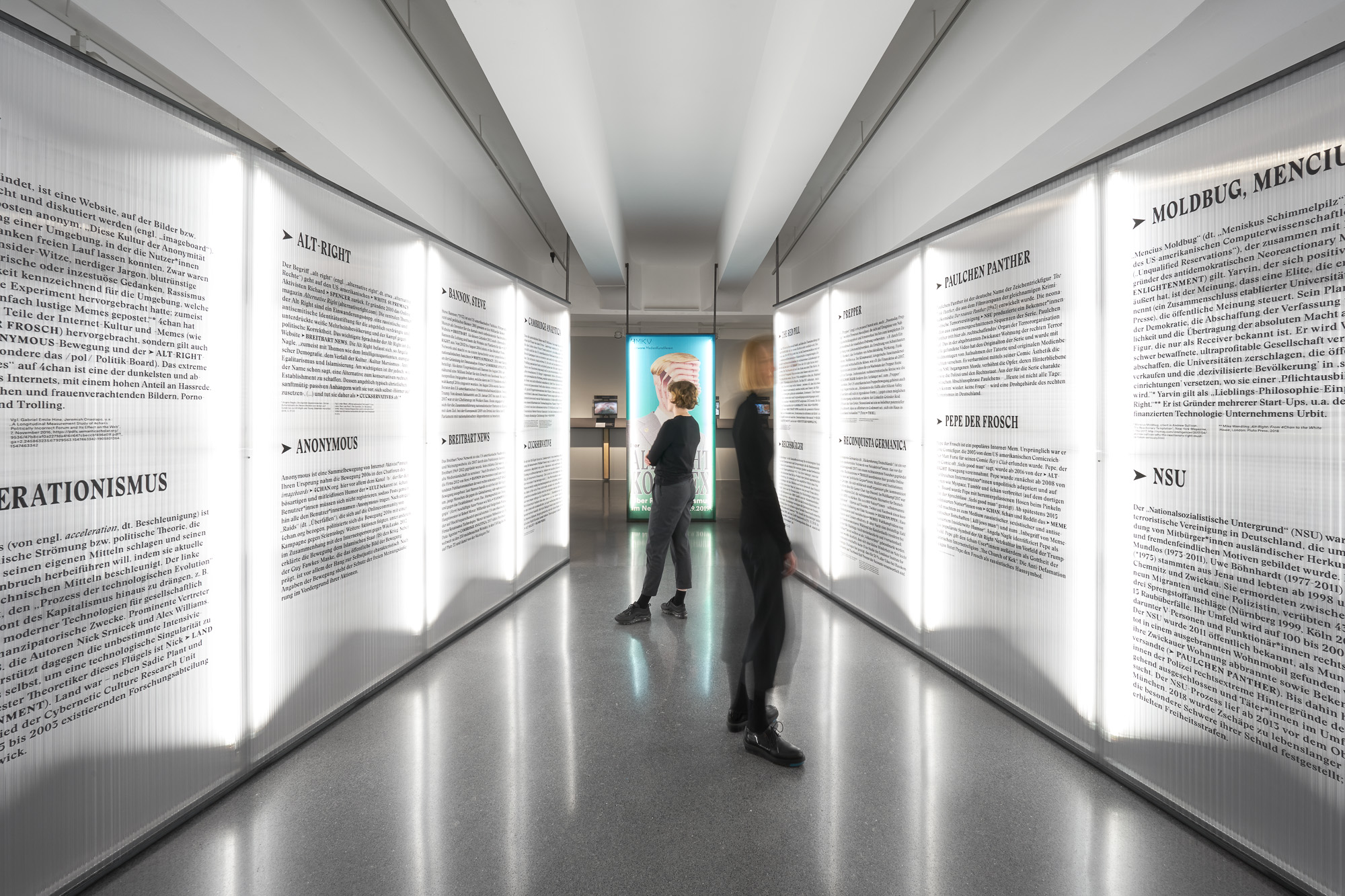 Die Ausstellung „Der Alt-Right Komplex“ vom HMKV im Dortmunder U thematisiert den zunehmenden Rechtspopulismus im Internet. Besonders durch Online Foren und Plattformen können User miteinander kommunizieren und ihr rechtspolulistisches Gedankengut austauschen. Dadurch entsteht eine (Sub-)Kultur, die eine verzerrte Sicht auf die Realität entwickelt hat. Szenografisch wird dieser Aspekt aufgegriffen, indem halbtransparente Doppelstegplatten genutzt werden. Diese erzeugen beim Durchsehen einen unscharfen und verzerrten Effekt. Personen werden nur noch als Silhouetten erkannt, die Typografie ist aus bestimmten Perspektiven verzerrt. Die Besucher:innen werden am Anfang durch eine Reuse in die Ausstellung geleitet. Die zulaufende Architektur, auf der sich ein Glossar mit den wichtigsten Namen und Begriffen aus der rechtspolulistischen Szene befindet, stimmt auf das Thema ein und zieht die Besucher:innen in die Ausstellung. Die Verengung des Glossars erweckt zusätzlich den Anschein, dass es schwierig ist wieder aus der Welt des Rechtspopulismus herauszufinden, wenn man erst einmal hineingezogen wurde.