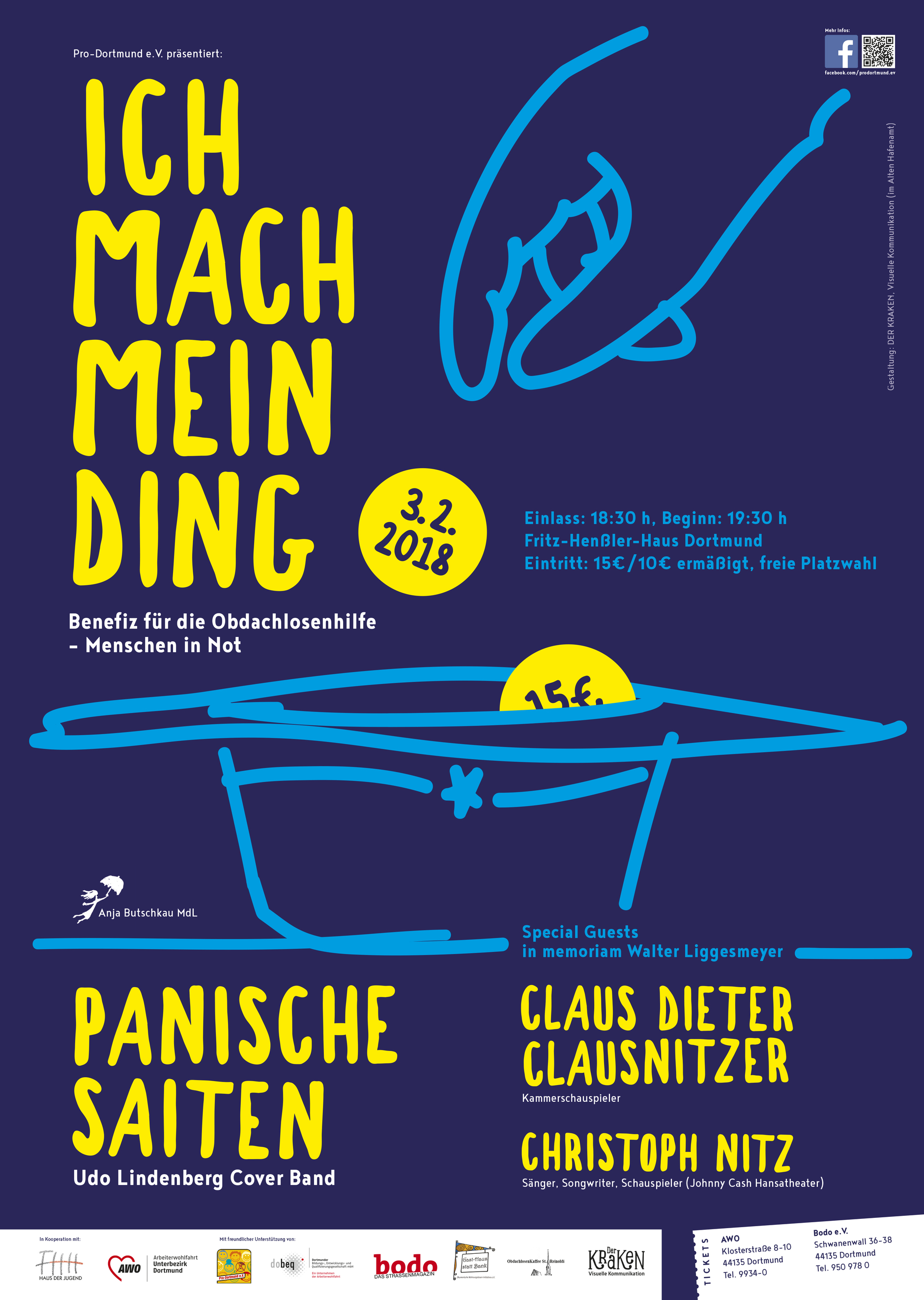 Auch wenn die Stadt Dortmund plant, die Schlafplätze für Wohnungslose dem steigenden Bedarf anzupassen, es bleibt eine Menge zu tun. Eine Möglichkeit dazu bietet zum Beispiel die Veranstaltung Ich mach mein Ding, ein Benefiz für die Obdachlosenhilfen, BODO, Gasthaus statt Bank und das Obdachlosenkaffee St. Reinoldi. Das von Pro-Dortmund e.V. initiierte Event findet zu Ehren des im Mai 2017 verstorbenen Malers und Schriftstellers Walter Liggesmeyer statt, der zu Lebzeiten Unterstützer vieler wohltätiger Initiativen war. Für die musikalische Untermalung sorgen die Panischen Saiten, ihres Zeichens authentische Coverband von Pop-Legende Udo Lindenberg. Alle Künstler/innen treten ohne Gage auf.