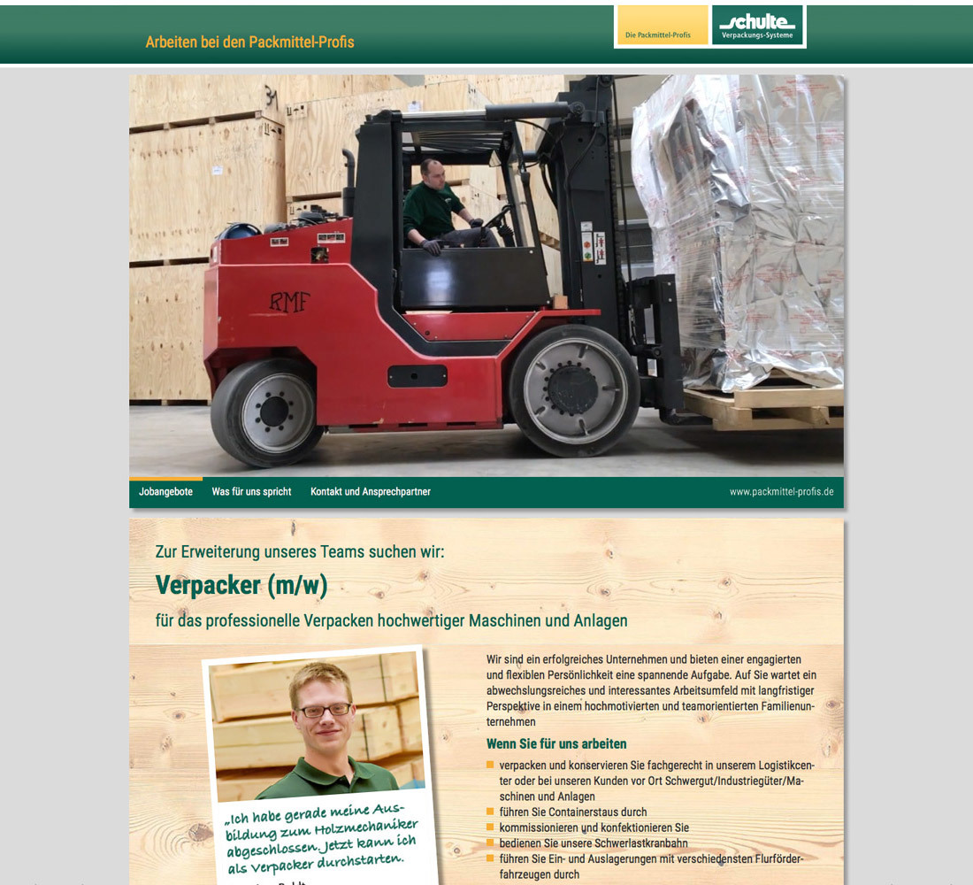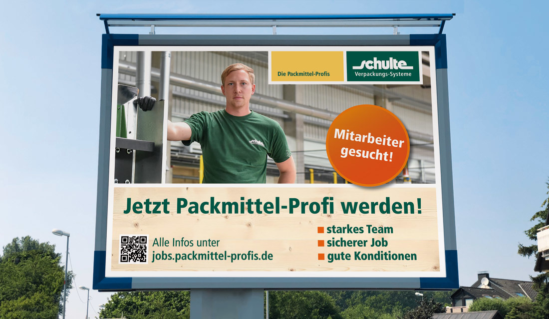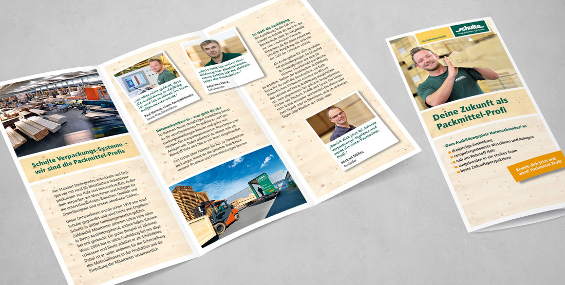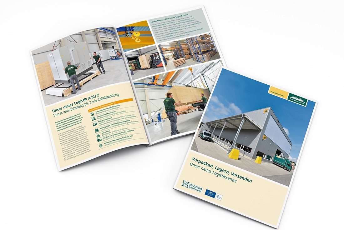 Kisten als Sonderanfertigung bis zu einer Länge von 20 m, Paletten und Schwergutverpackungen sind die Kernprodukte der Schulte Verpackungs-Systeme GmbH. Dazu kommen Dienstleistungen rund um den Bereich Verpacken und Logistik – für unterschiedlichste Zielgruppen wie Rohrwerke, chemische Betriebe oder die Deutsche Bundesbank. Das verlangt nach einer Gestaltung, die genauso robust, flexibel und alltagstauglich ist wie die Produkte von Schulte selbst. Die Betreuung des Corporate Designs läuft bereits seit 1995. Im Laufe der Zeit wurden zahlreiche Maßnahmen realisiert – von Geschäftsdrucksachen und Broschüren über technische Aufbauanleitungen, Hallenbeschilderung und das Wegeleitsystem bis hin zur Arbeitskleidung.