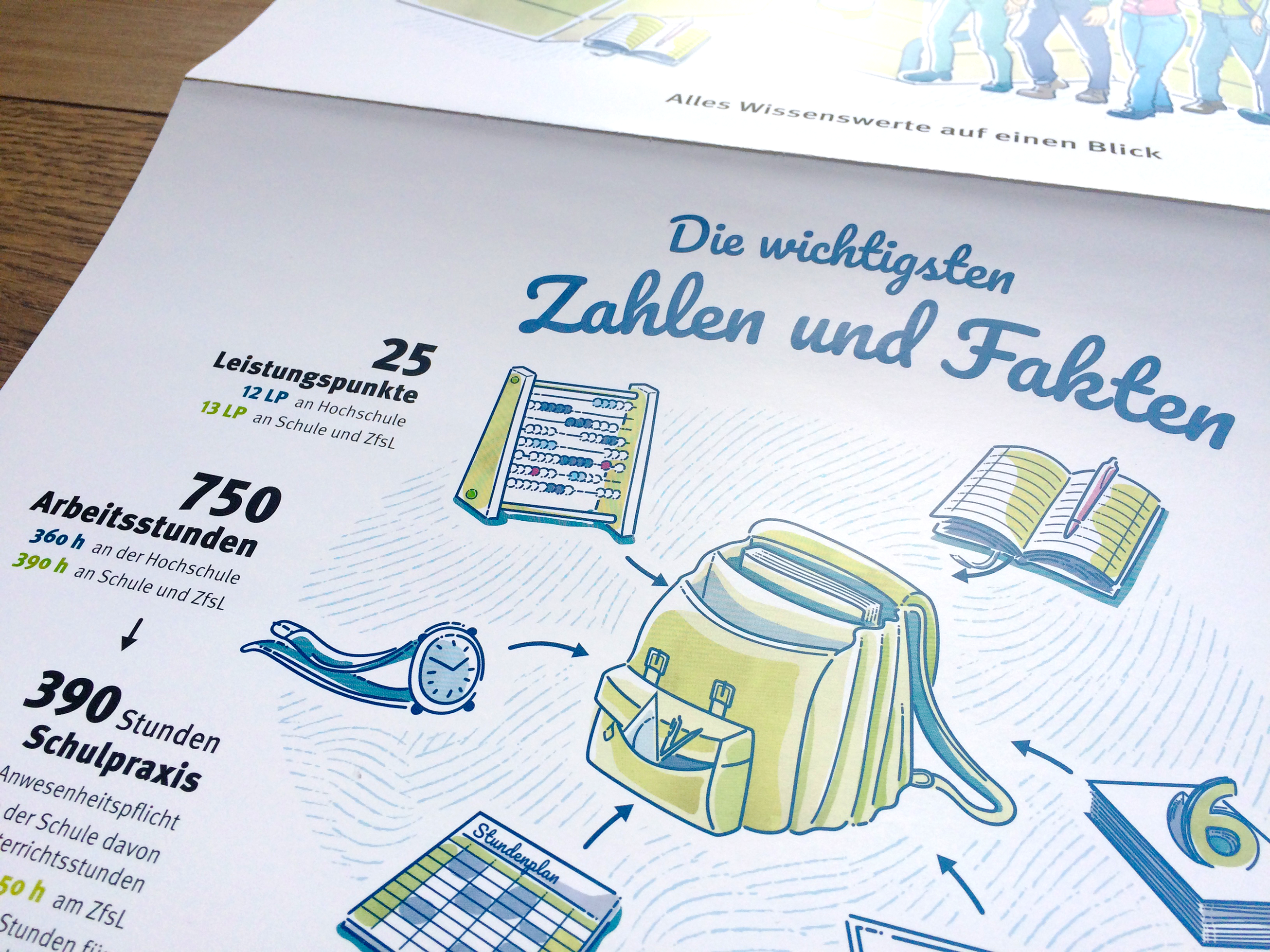 Ein Wegweiser für Lehramtstudierende in Nordrhein-Westfalen Das Lehramtsstudium an deutschen Universitäten beinhaltet den Pflichtblock des „Praxissemesters“, bei dem die Studierenden erste Lehrerfahrungen in der Schule machen sollen. Die Besonderheiten dieses Semesterblocks wurden zu einer Infografik zusammengefasst, die sowohl in den beratenden Instituten aushängt, als auch als Falzposter in einer Informationsmappe für alle Studierenden publiziert wurde. Neben den praktischen To-Do's und zu erbringenden Leistungen der Studierenden wurde eine zweite Storyline entwickelt, die auf die emotionale Reise des Studierenden und auf Fragestellungen während dieses Semsters eingeht und den Studierenden hilfreiche Anregungen für die eigene Entwicklung geben sollen. Für die Darstellung und Illustration der Inhalte wurde ein realistischer, detaillierter und freundlicher Illustrationsstil entwickelt, der sowohl das Thema „Reise“ als auch das Thema „Schule“ miteinander verbindet. Die Farbgestaltung hält sich an das Corporate Design der Hochschule.