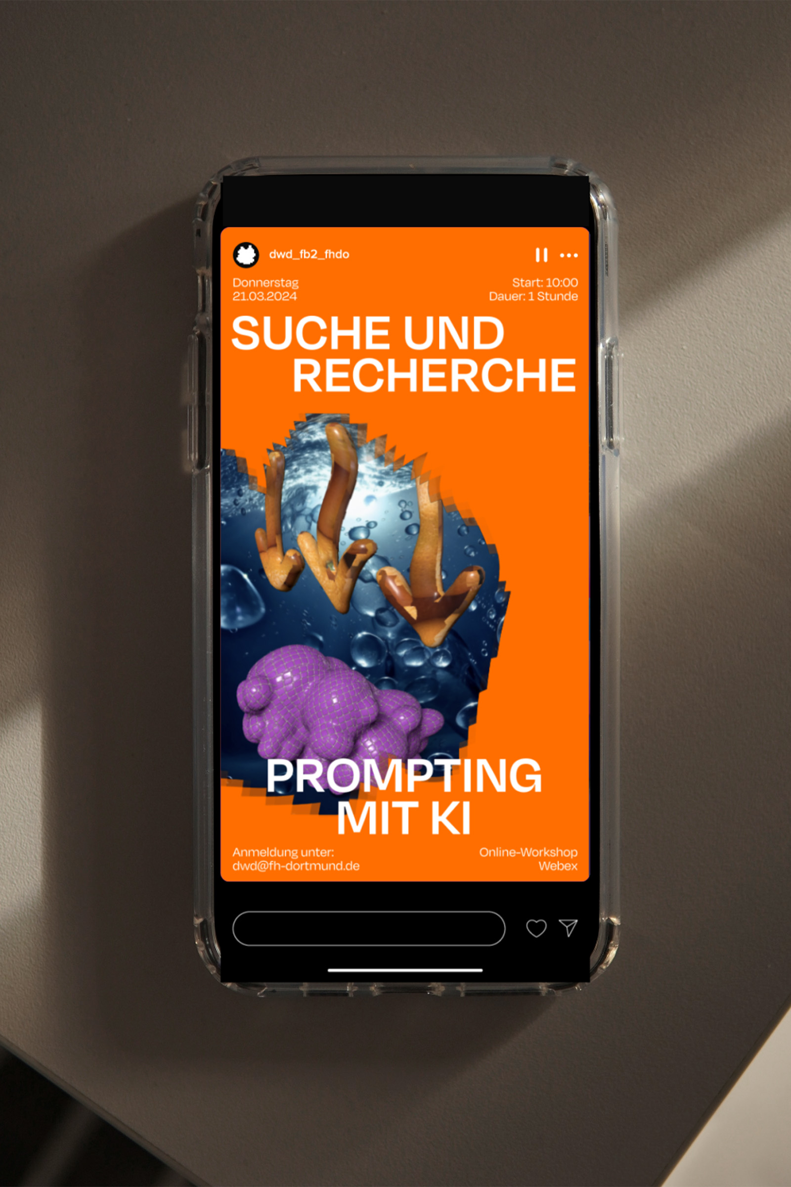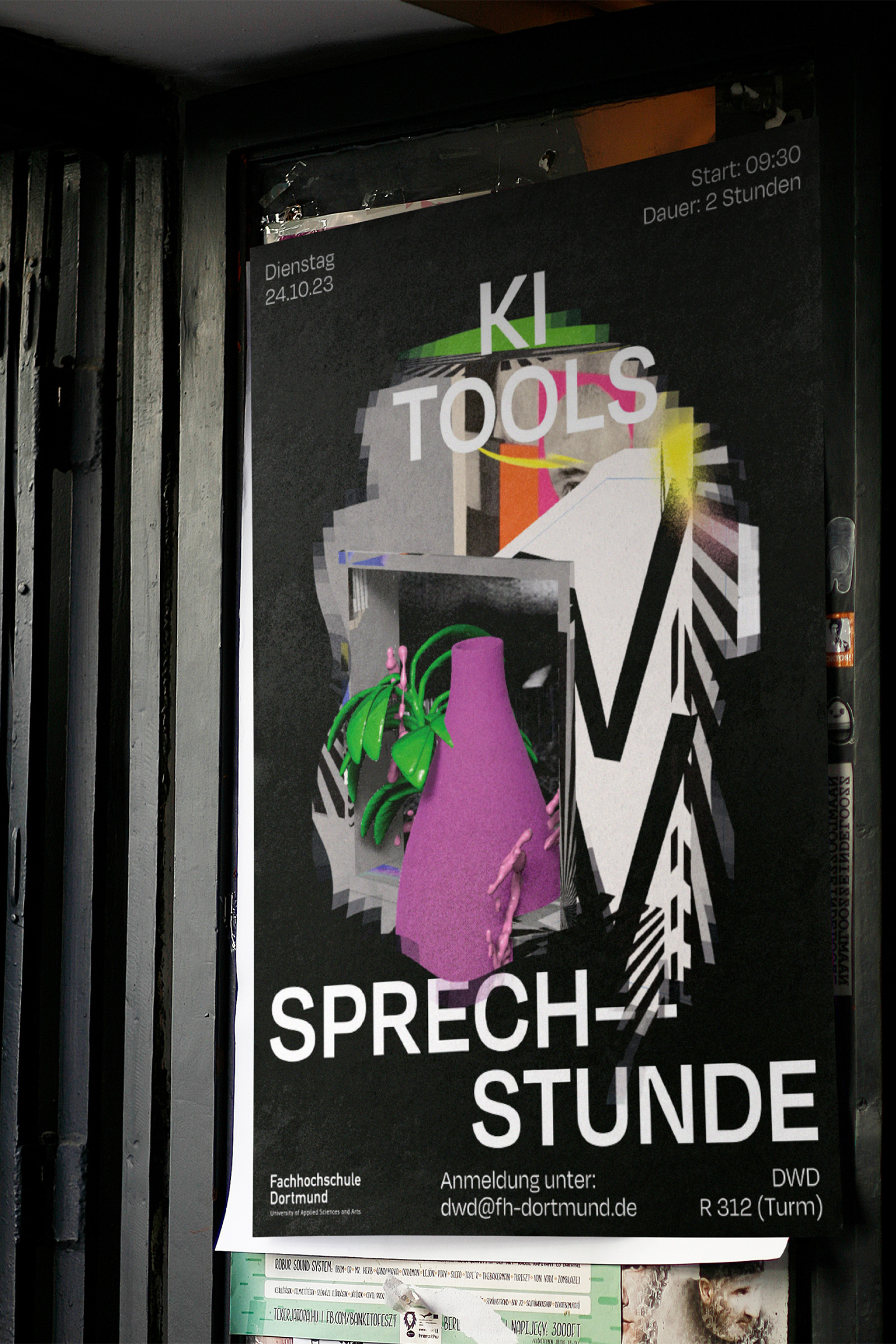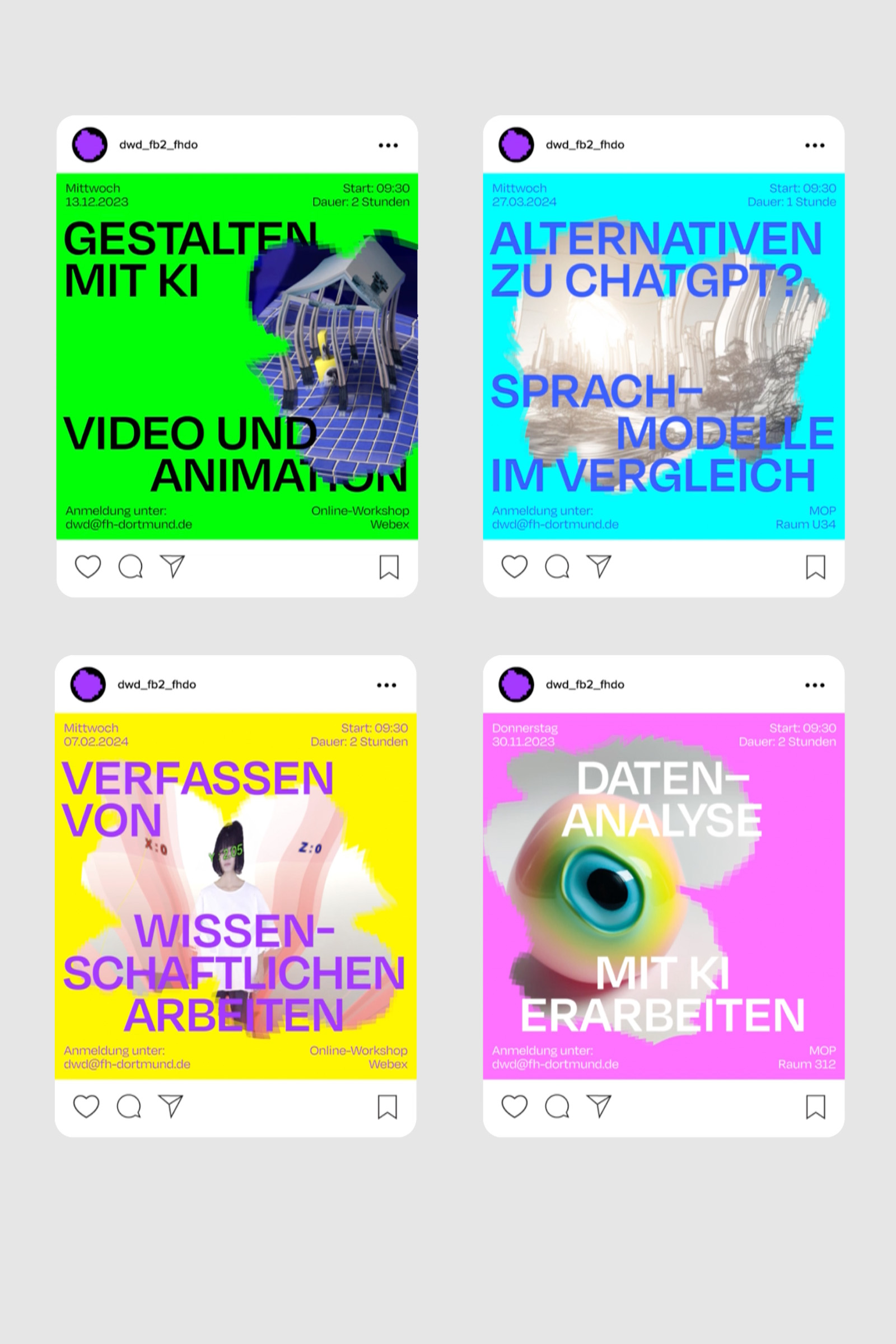 Die Digitale Werkstatt Design (DWD) ist ein kollaboratives, digitales Lehr- und Lernlabor für alle Studiengänge am Fachbereich Design der Fachhochschule Dortmund, in dem das gemeinsame Lehren und Lernen ergänzt und gefördert wird. Als Ansprechpartner bietet das Labor Support für Studierende und Lehrende – zum Beispiel bei eigenen, digitalen Projekt- oder Workshopideen // Das 2023 entwickelte modulare Designsystem des Erscheinungsbildes spiegelt den experimentellen Charakter der Arbeiten wider, die im Rahmen der Digitalen Werkstatt Design entstehen und ist so konzipiert, dass die definierten Vorlagen für verschiedene Social Media Formate, Veranstaltungsplakate und Postkarten autark vom Team der DWD genutzt und angepasst werden können.