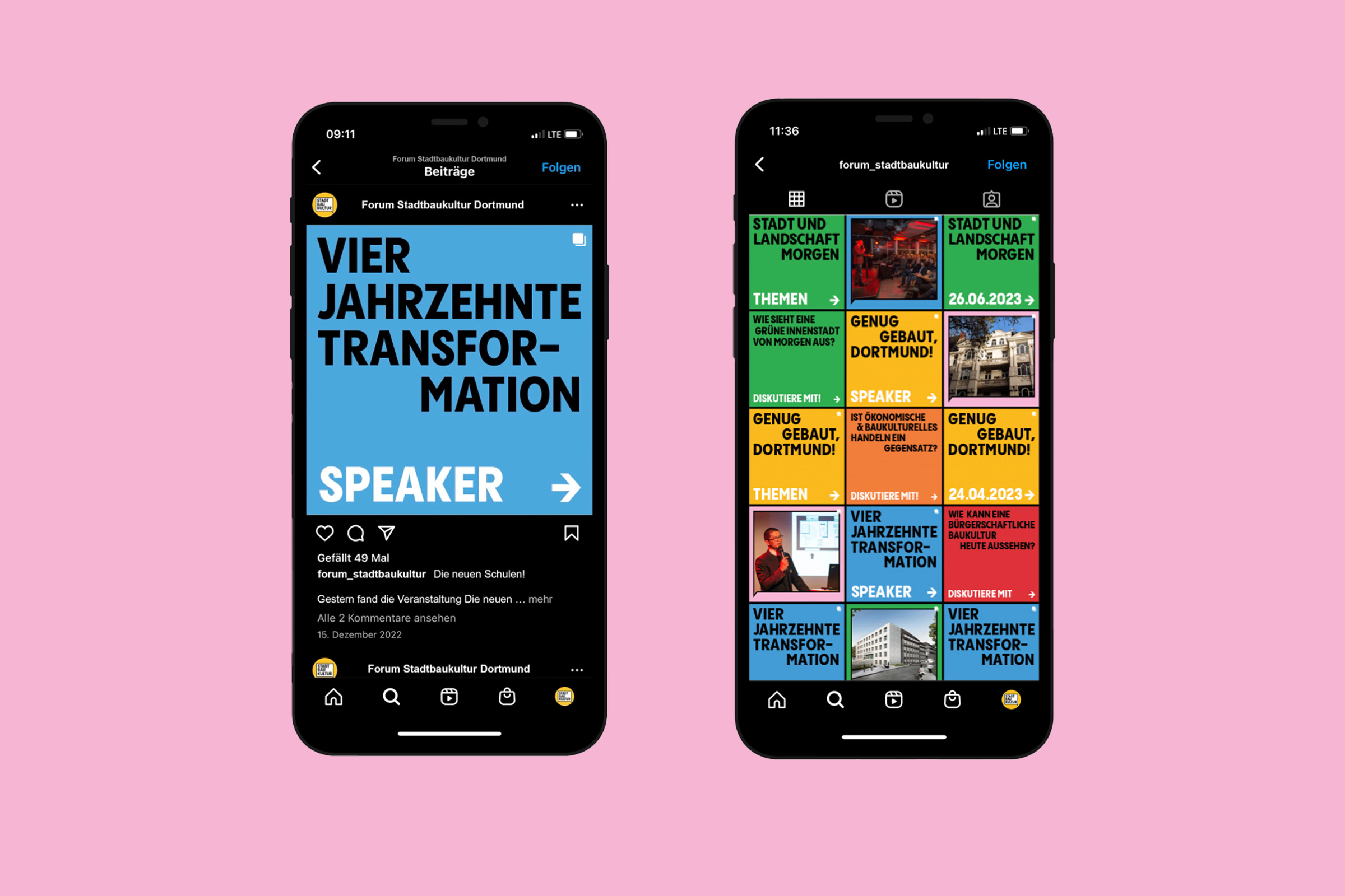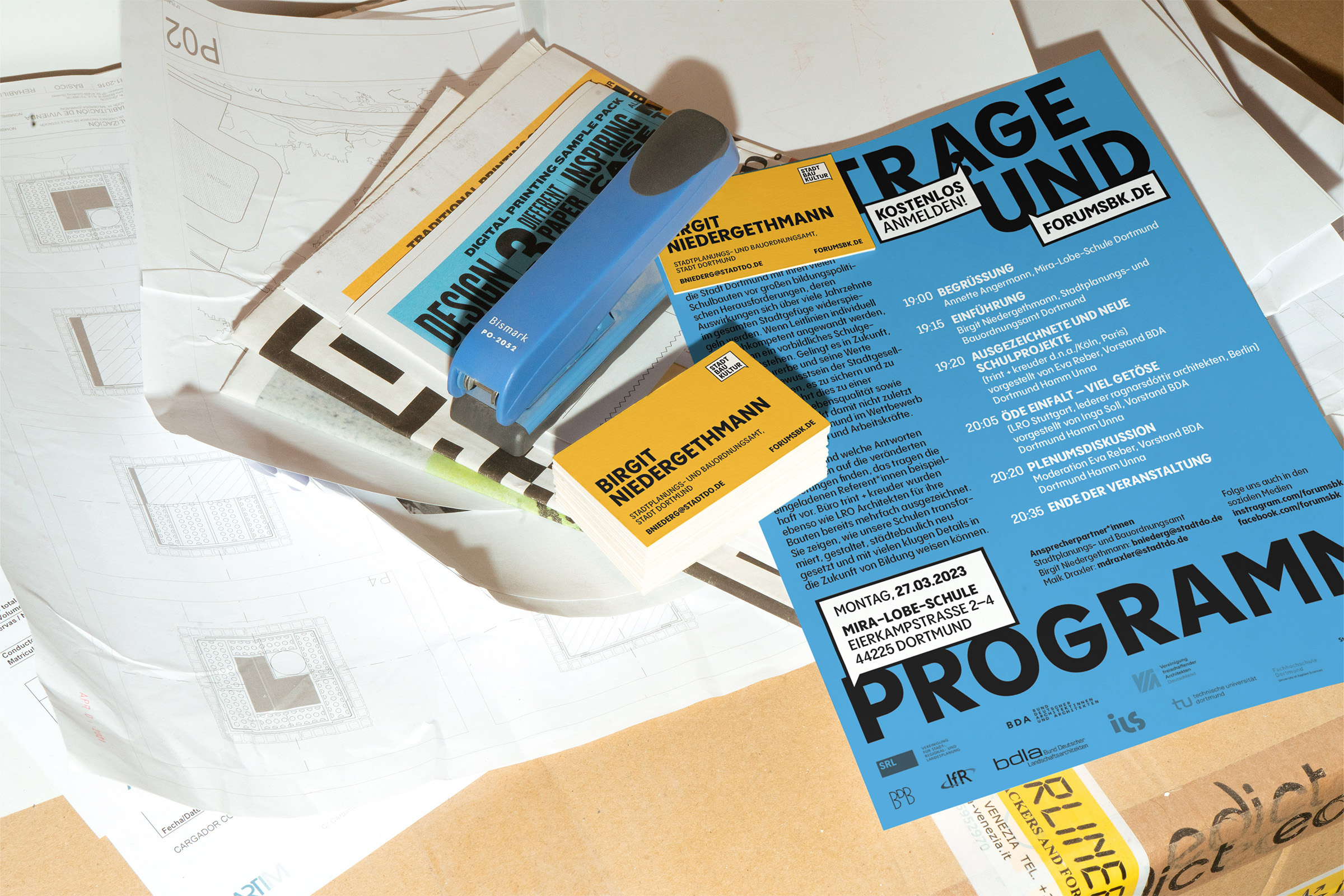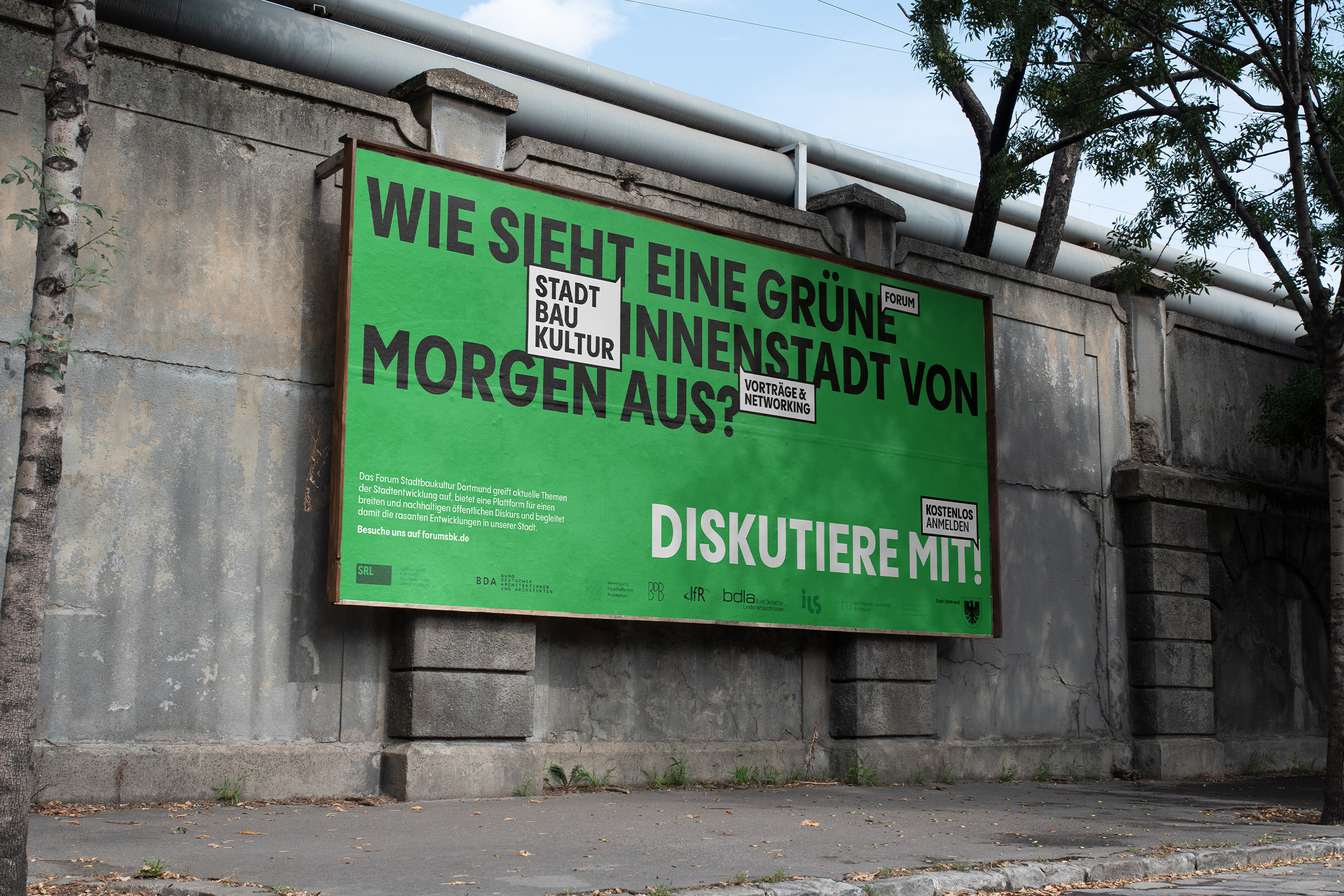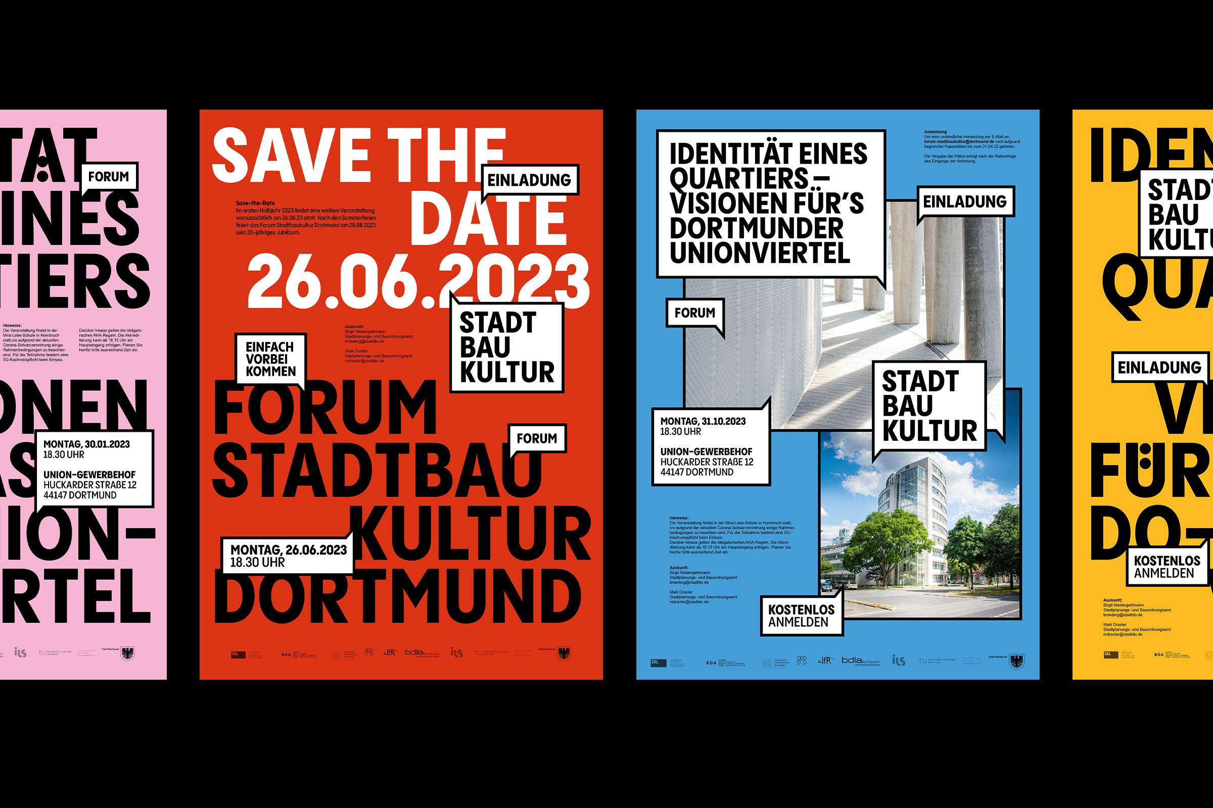 Das Forum Stadtbaukultur ist Teil des Stadtplanungs- und Bauordnungsamt der Stadt Dortmund. Monatlich greift es aktuelle Themen der Stadtentwicklung auf, bietet eine Plattform für einen breiten und nachhaltigen öffentlichen Diskurs und begleitet damit die rasanten Entwicklungen innerhalb der Stadt Dortmund // Die 2023 entwickelte neuen visuellen Markenidentität entstand als Einreichung im Rahmen eines vom Forum Stadtbaukultur initiierten Pitches [nicht realisiert]. Das Konzept basiert auf der Sprechblase als zentrale Form, dem Einsatz markanter Typografie und einer breiten Farbvarianz. Gemeinsam symbolisieren die Gestaltungselemente den im Forum Stadtbaukultur stattfindenden Austausch.