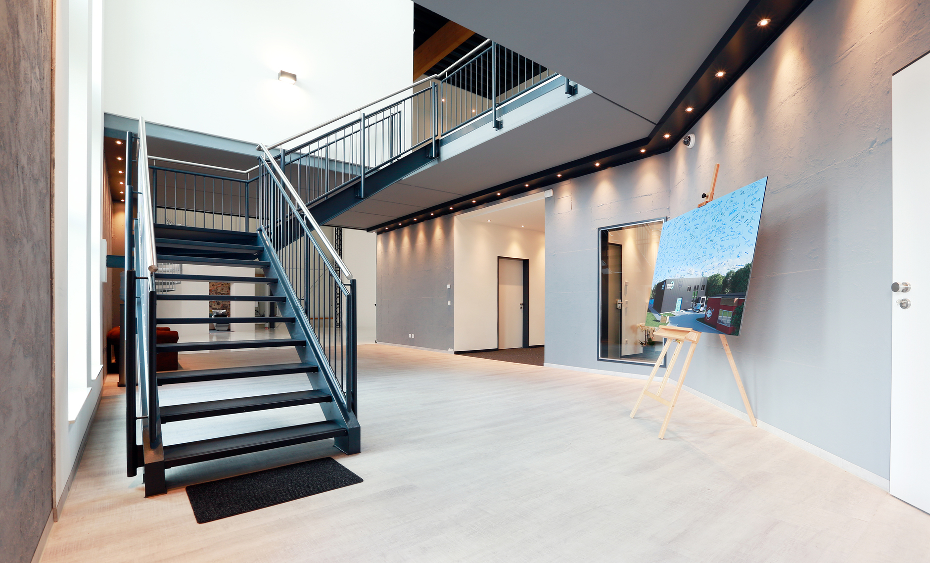 Die Eröffnungsparty ist gefeiert und unser Studio startklar für zahlreiche coole Projekte. Da liegt es natürlich nahe, dass wir unsere heiligen Hallen für Euch einmal in Szene setzen. Also, genießt diesen kleinen Rundgang und kommt mit auf eine Reise durch das Studio Duisburg!Unser Herzstück – das eigentliche Studio – seht Ihr auf dem Bild ganz oben. Um die Größenverhältnisse deutlich zu machen, hat sich unser Fotograf Lars ins Foto geschlichen. Das Studio ist insgesamt acht Meter hoch.Hier der weitläufige Eingangsbereich des Gebäudes: Auf dem nächsten Foto seht Ihr den Übergang vom Eingang in Richtung Studio. Rechts im Bild eines der Highlights: Während sich unten der Visagistenraum mit Haarwaschbecken befindet, haben wir oben drüber eine kleine, aber feine Lounge eingerichtet. Von dort hat der Kunde alles im Blick und kann sich bei einem leckeren Kaffee in Ruhe das Shooting anschauen. Außerdem seht Ihr hier unser Rolltor, wodurch Fahrzeuge direkt in das Studio gelangen können.